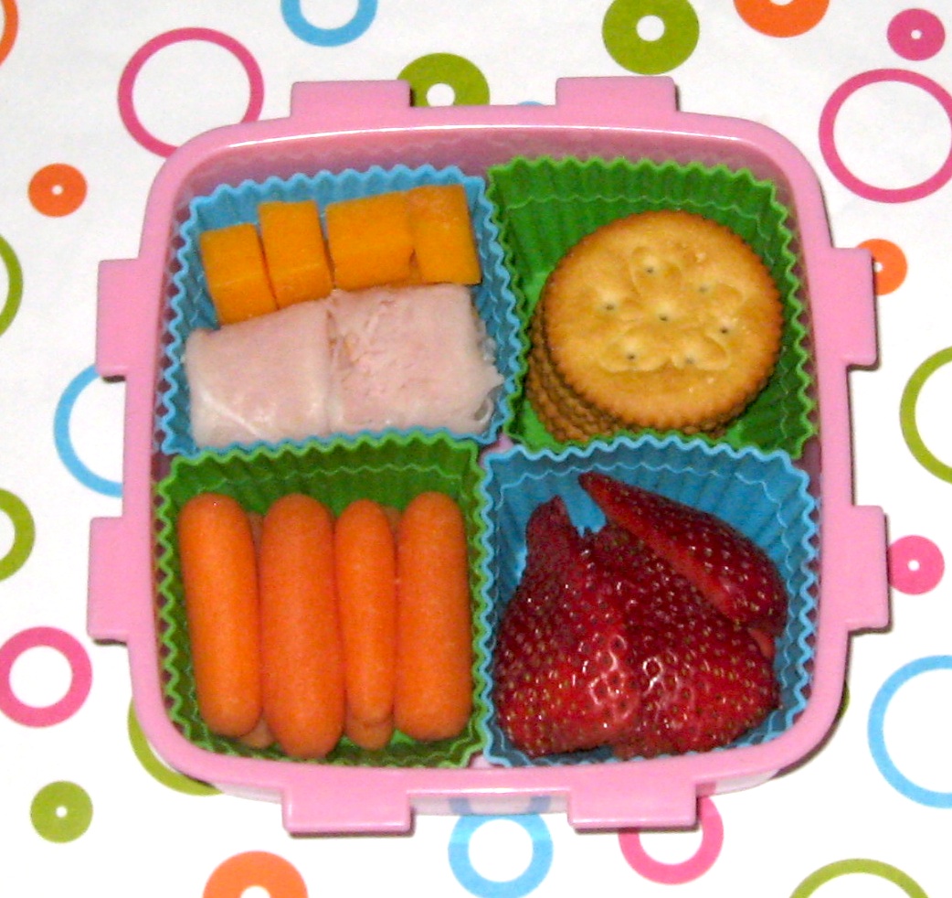 The other day, Ben wanted a lunchable-style lunch, but only with food he liked in it, so we made our own. This one is actually Faith's, but his would be the same with a few blueberries too. They had sharp cheddar cheese cubes, some rolled turkey, Ritz crackers, carrot sticks, and strawberries. Not picture, they had yogurt and granola. I've been buying yogurt and packaging it separately for them, so I can have a weeks worth of grab&go yogurt just waiting in the fridge for lunches, in reusable containers of course!
