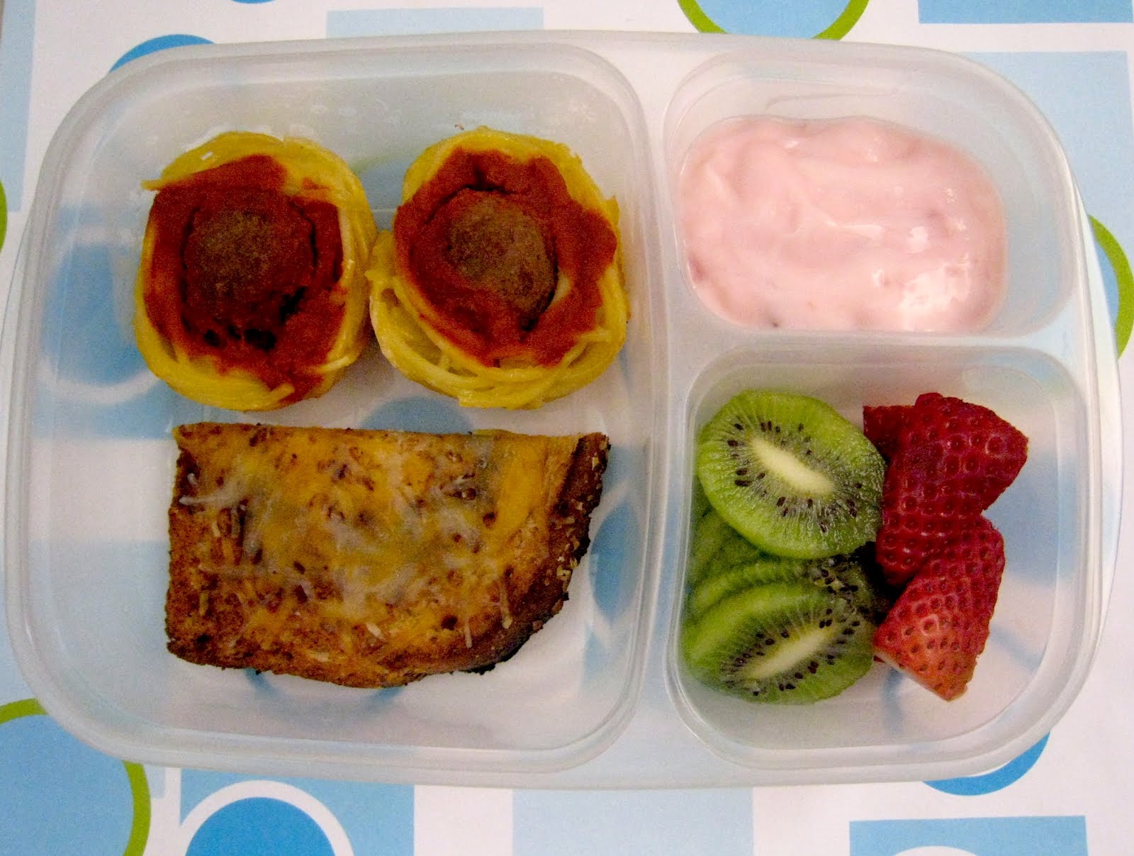 Ben had two spaghetti & meatball cupcakes, a slice of garlic bread, strawberry yogurt, a kiwi and strawberry slices. Faith had the same, but no kiwi. She doesn't like kiwi. It's packed in our Easy Lunchboxes (also available on Amazon).