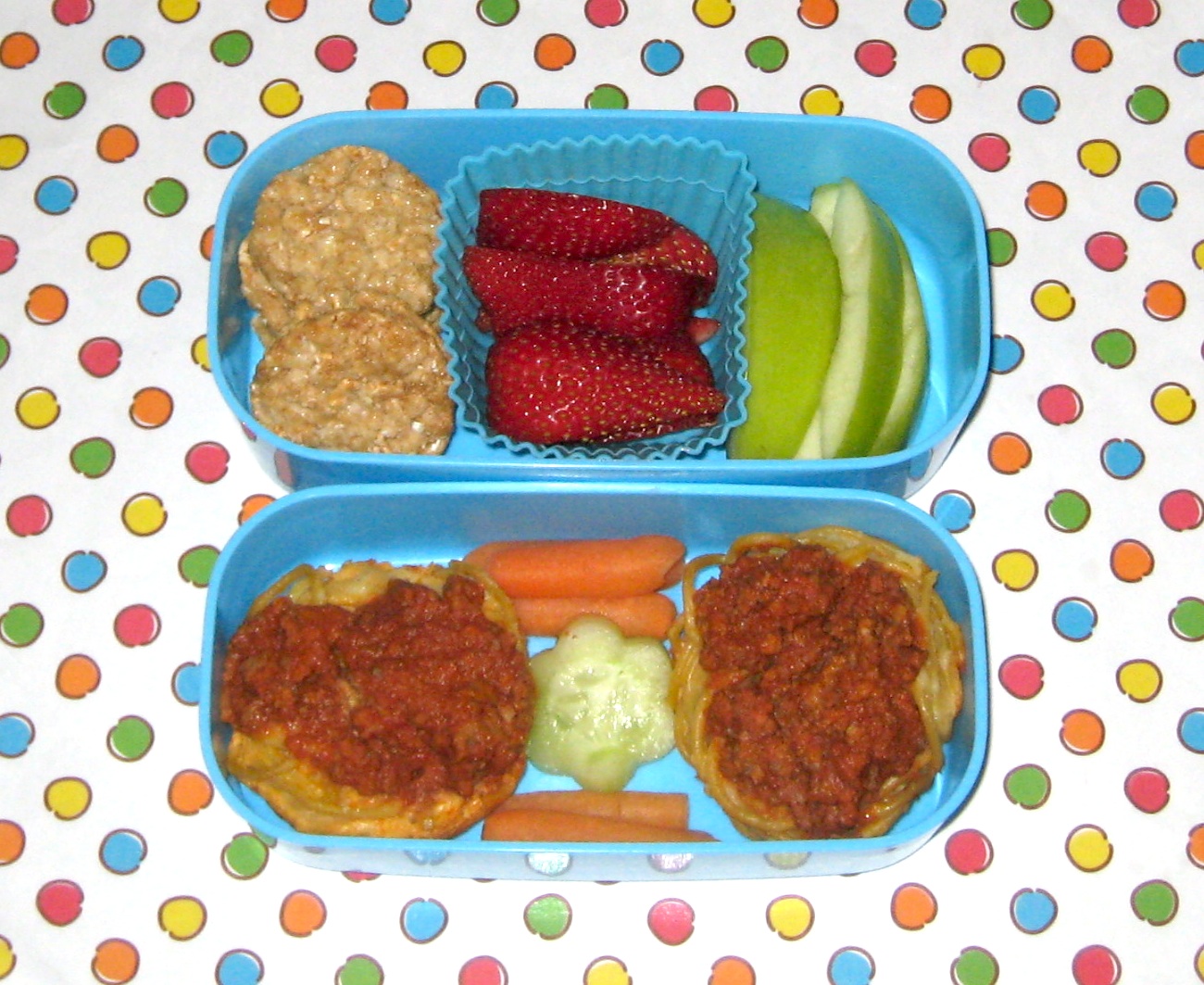So both kids had two of the spaghetti cupcakes, the last of the carrots and cucumber, some apples, some strawberries, and some blueberry-pomegranate crisps; simple, yummy, and minimal work for me!