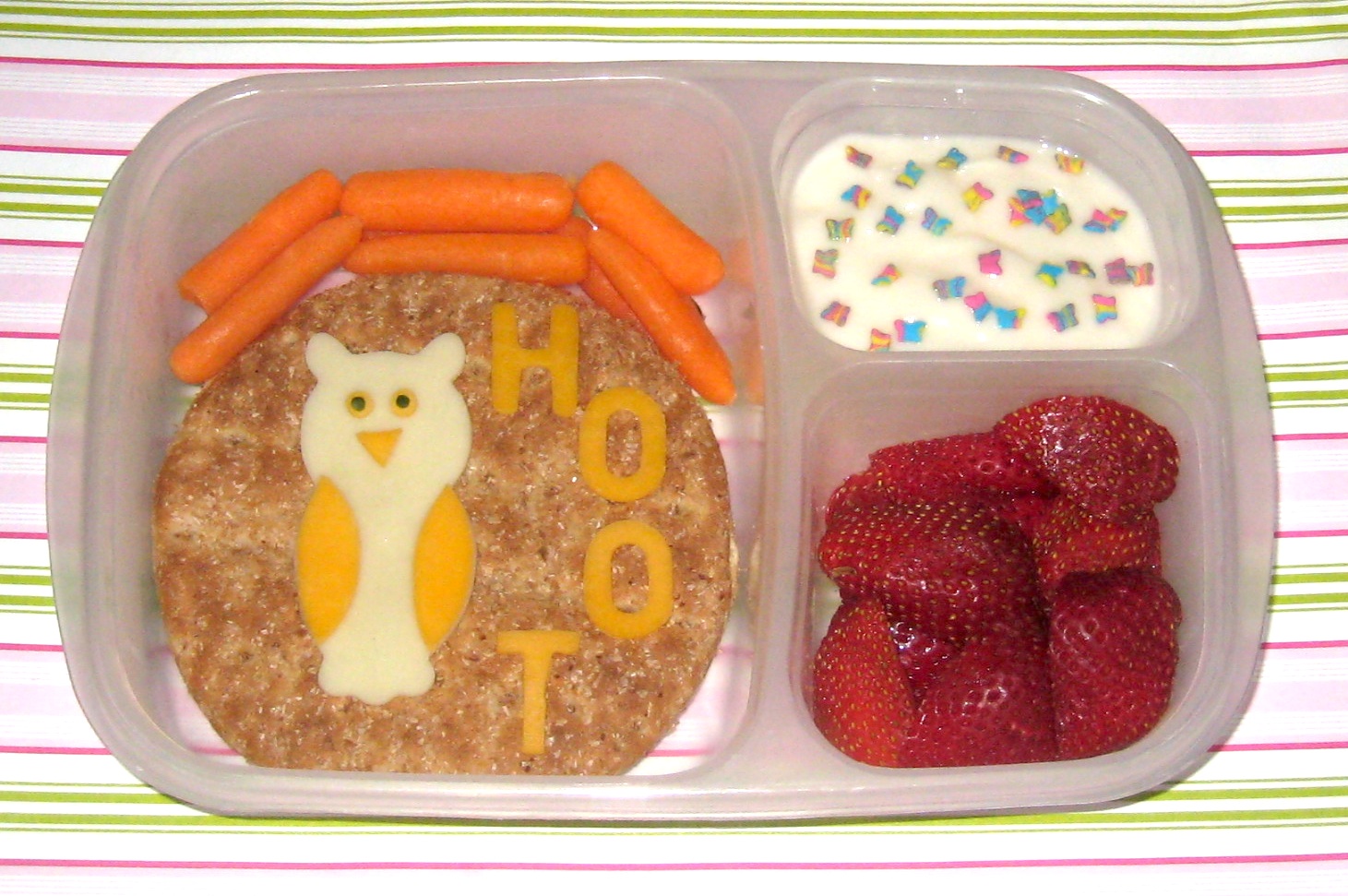 Faith has a peppered turkey and cheese sandwich on whole wheat rounds, topped with a very smart owl. The owl is made from provolone, with cheddar accents, and some cucumber bits to make his eyes. "Hoot" is also made from cheddar. To go with her sandwich, she has carrots, strawberries and vanilla yogurt with butterfly sprinkles.