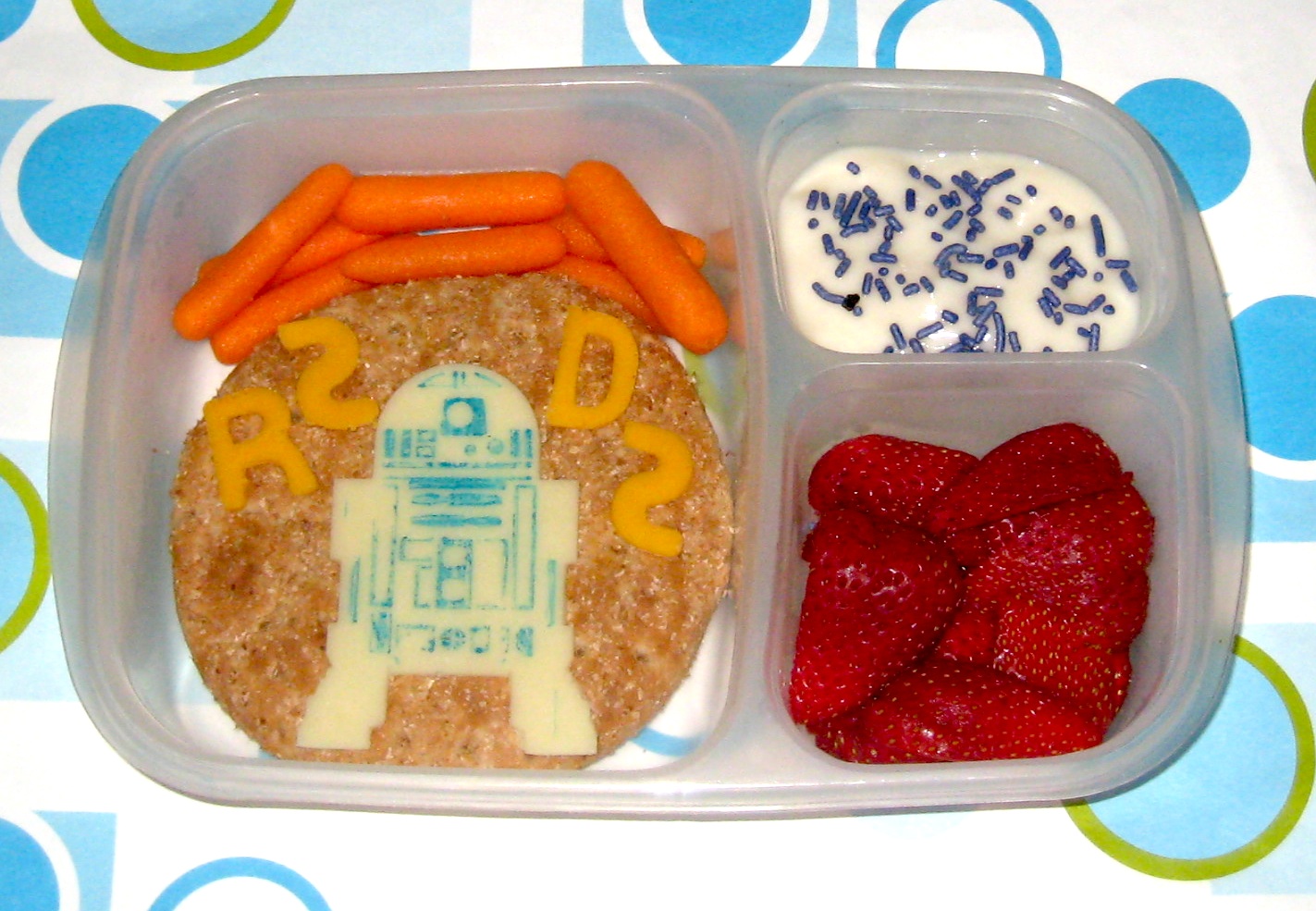Ben has a turkey and cheese sandwich, topped with an R2D2. He is cut with the Williams Sonoma cookie cutters for the shape, then I used food coloring markers to lightly scribble over the indentations so that I was left with a nice blue imprint, his name is also cut from some new letter cutters I got for me at Williams Sonoma.  To go with this, he had carrots, yogurt with sprinkles and strawberries.  We were going to make Star Wars cookies, but our sugar cookie batch was a disaster (did not roll or cut, so I just gave up, rolled them in balls and we had round cookies).  We may still make some this weekend with a better recipe.