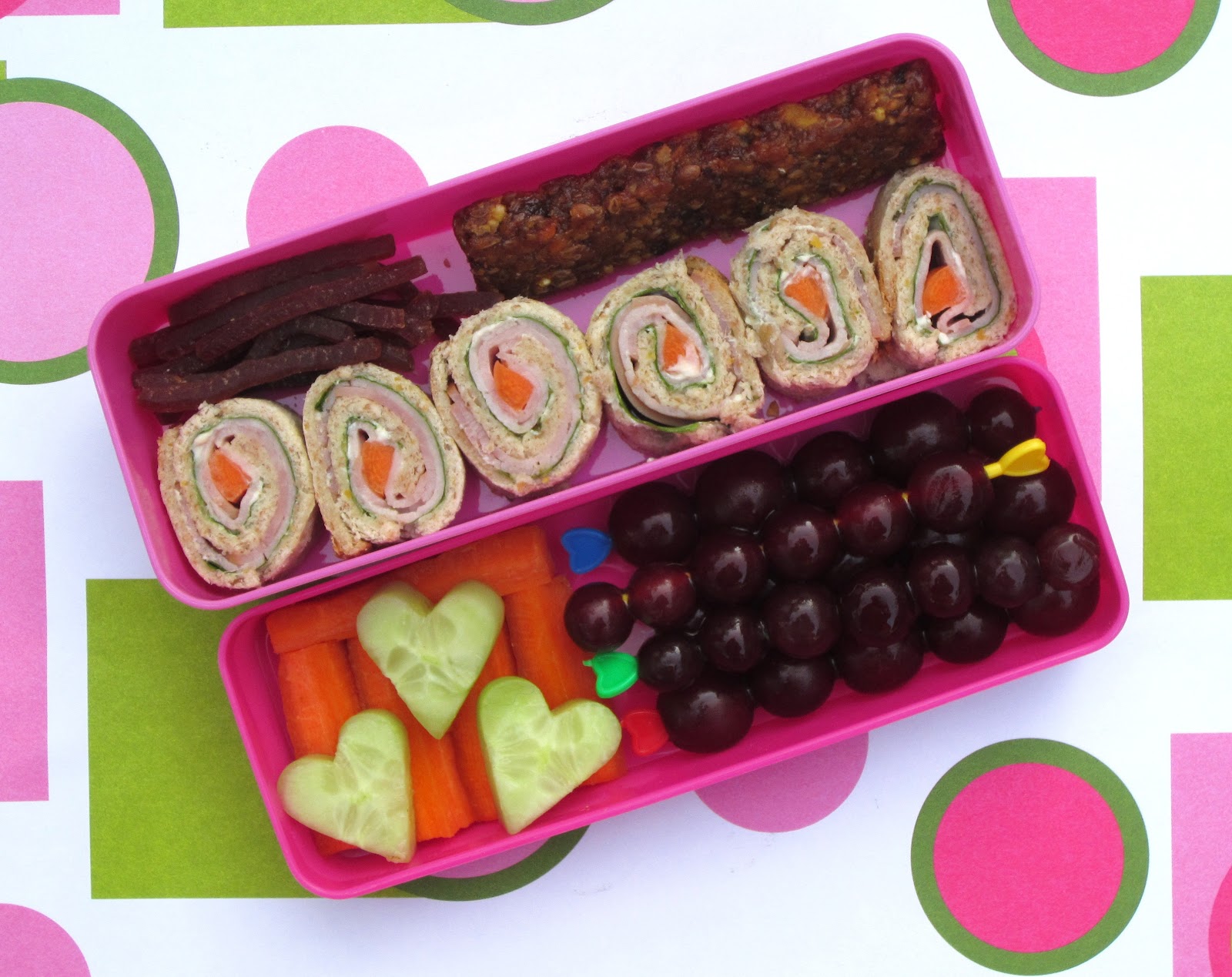 Today, Faith had faux sushis with rolled out multigrain breads, romaine lettuce, ham, cream cheese and a sliver of carrot. I thought they really turned out cute! To go with it, she had skewers of grapes, the leftover bits of carrots from the sandwich, and cucumber hearts. At the last minute, I discovered we were out of veggie straws, so I subbed in some Plum Kids Organic Fruit Shreds (peach) and half of a Gnu Foods Carrot Cake Bar. The Gnu bar was from a swap and the Plum Kids shreds were a sample, the kids loved both!