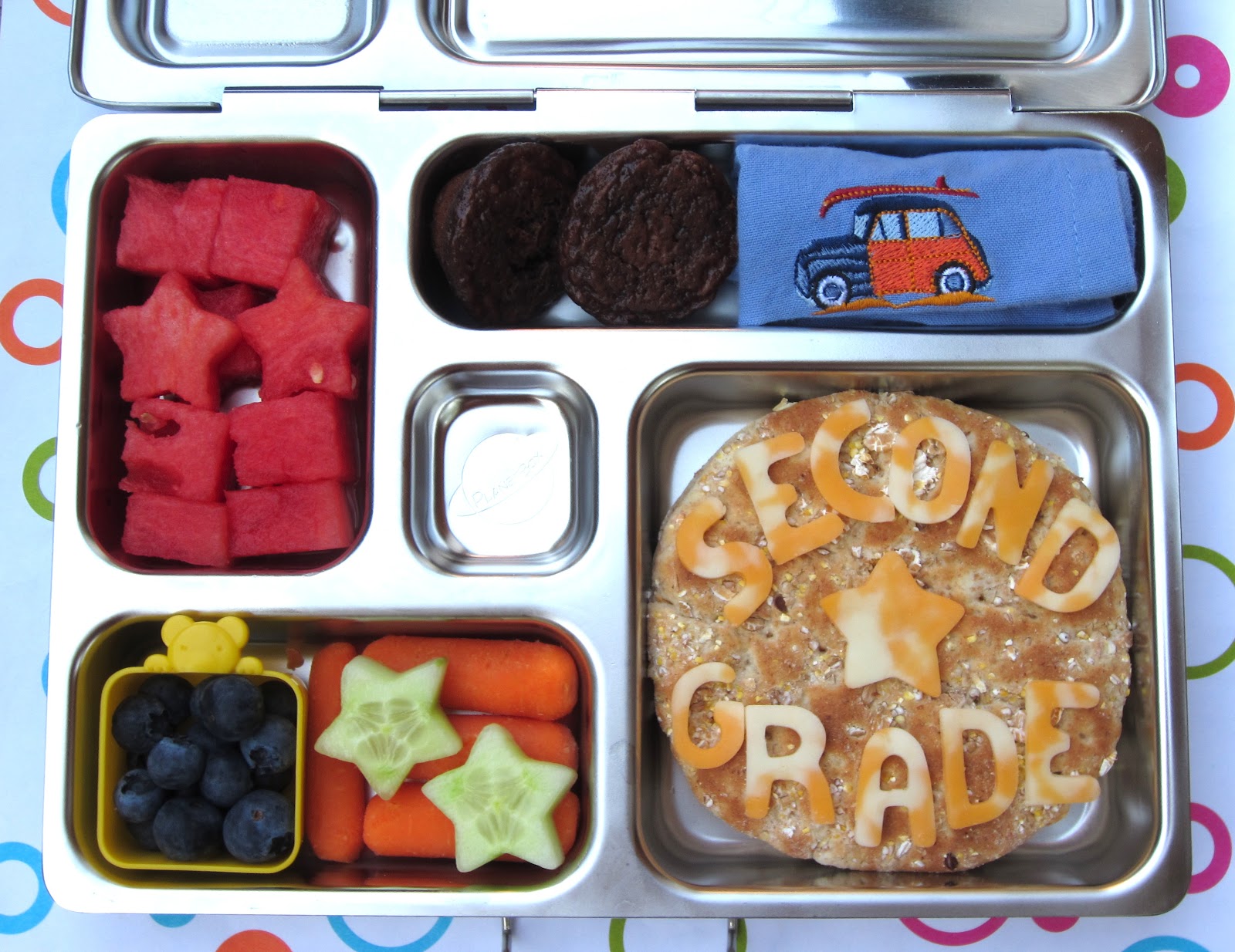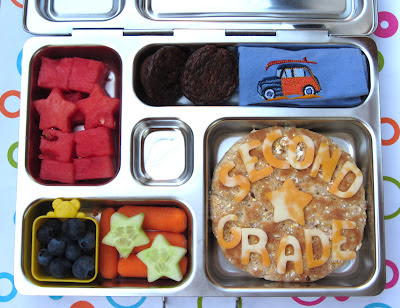 Ben had a turkey and provolone sandwich on multigrain rounds, topped with a "Second Grade Star" pattern (made from a marbled cheese. He had blueberries, carrots and cucumber stars, watermelon with a few more stars and two mini brownie bites from the other new handy-dandy kitchen machine I bought recently. The extra space in the box was perfect for one of his Fabkins napkins.