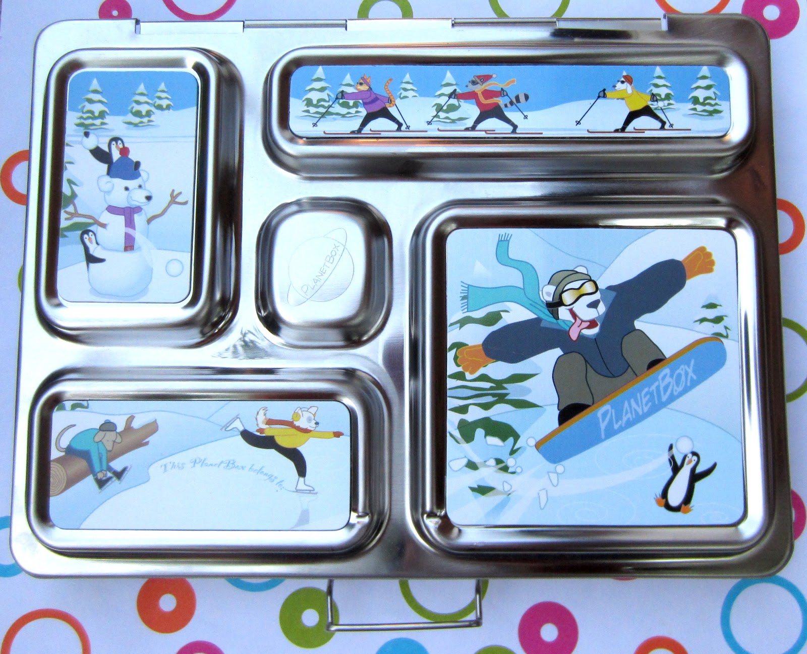 I was more than a bit excited when PlanetBox offered to send me a set to try out for the kids. They had some serious negotiations on the bag color (turquoise won) but managed to quickly compromise on the magnet set (there was a winter/skiing set).