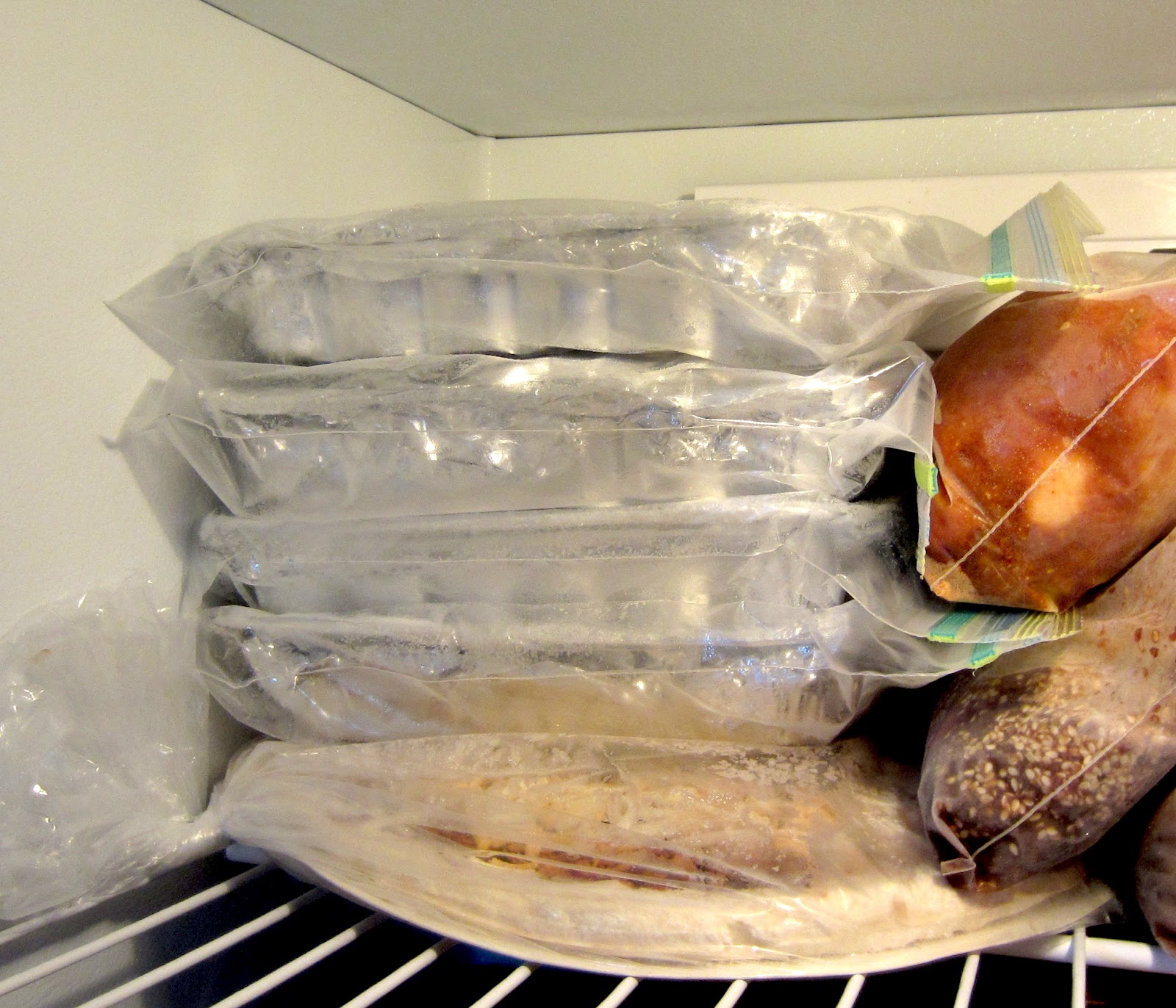 But I'm happy, 14 ready-to-go meals, many of which are require little to no effort on my part to serve. It's not like we don't always have steamed rice around the house! I think I'll do this again in a few weeks, or at least the next time I stock up on meats. I've spent quite a bit of time admiring the top shelf of my freezer!