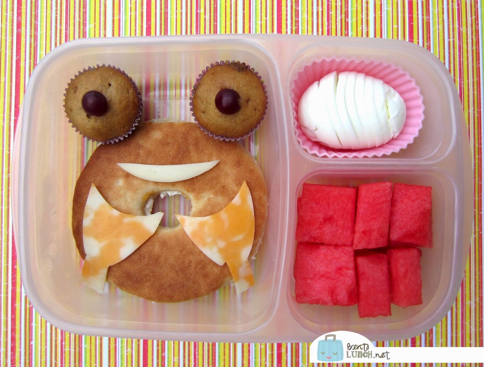 The kids had identical lunches today, but this one is Faith's. She had cream cheese and cantaloupe preserves on a bagel thin, two homemade banana-chocolate chip mini muffins, a boiled egg and watermelon. The aforementioned cheese cutouts and grape pieces finished out the design. It's packed in our Easy Lunchboxes (also available on Amazon).