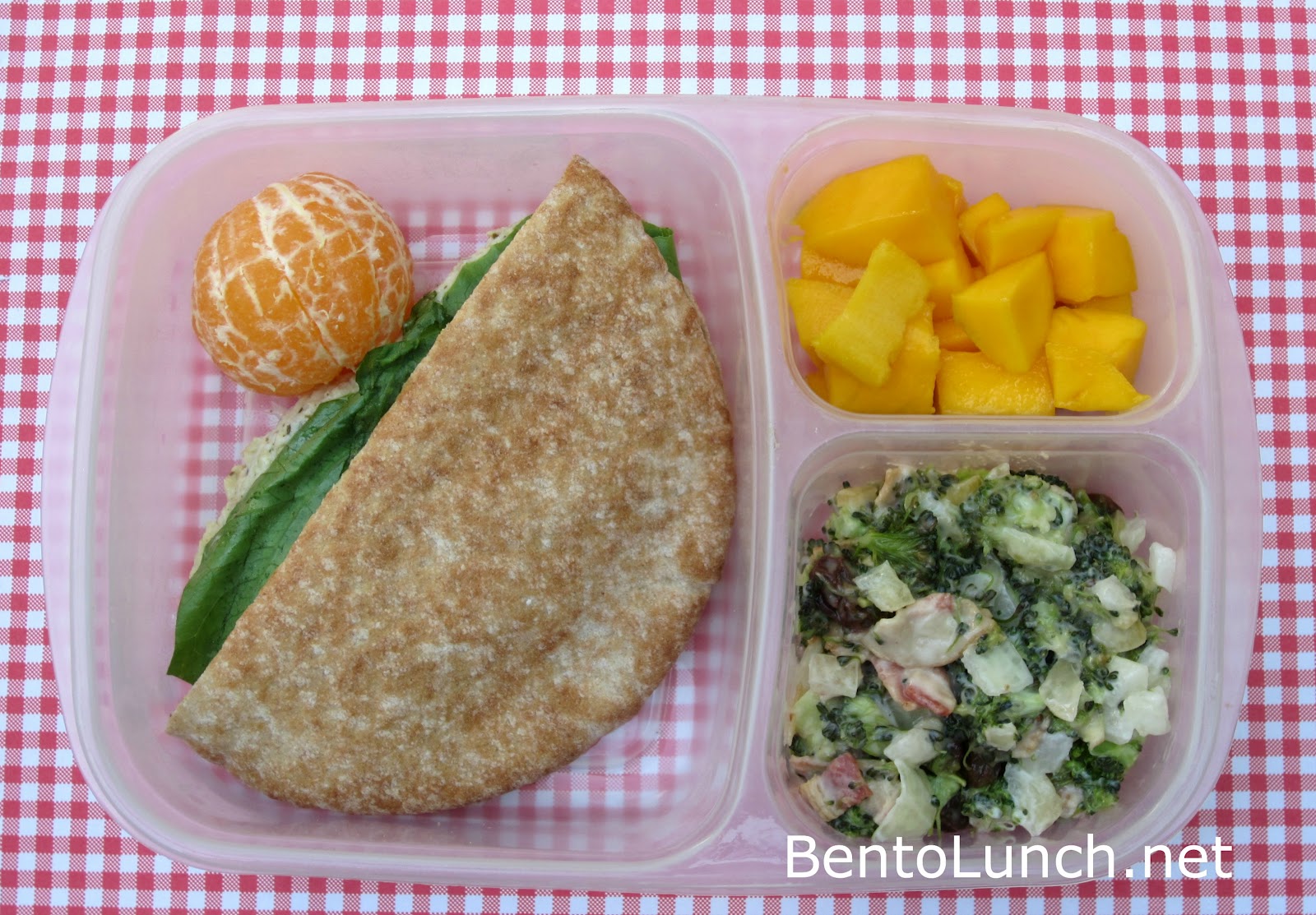 So what does the husband eat?  I made him a pesto chicken salad and stuffed it into a whole grain pita with some romaine lettuce.  Side dishes were broccoli salad with bacon, chopped mango and a mini orange.  I added some gatorade and a bottle of water too.  It's packed in our Easy Lunchboxes (also available on Amazon).
