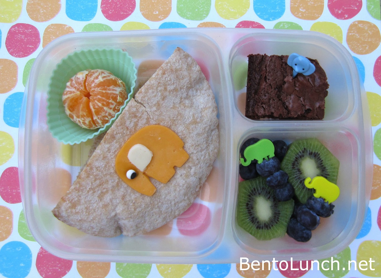 Ben had a ham salad pocket, topped with a cheddar elephant, provolone ear and sugar eye. He has a bit of homemade brownie with an elephant pick, kiwis and blueberries with other elephant picks, and a mini orange. It's packed in our Easy Lunchboxes (also available on Amazon).