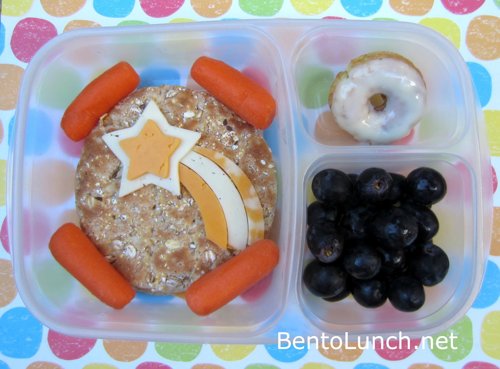 Faith has a turkey and cheese sandwich on multigrain rounds, topped with a shooting star. I used muenster, cheddar, and marble to make the detail stand out. To go with that, she has carrots, black grapes and a mini-pumpkin donut. I am slightly addicted to the mini donut maker, and the Dunkin Hines glazes for quickly topping the fresh donuts. It's packed in our Easy Lunchboxes (also available on Amazon).