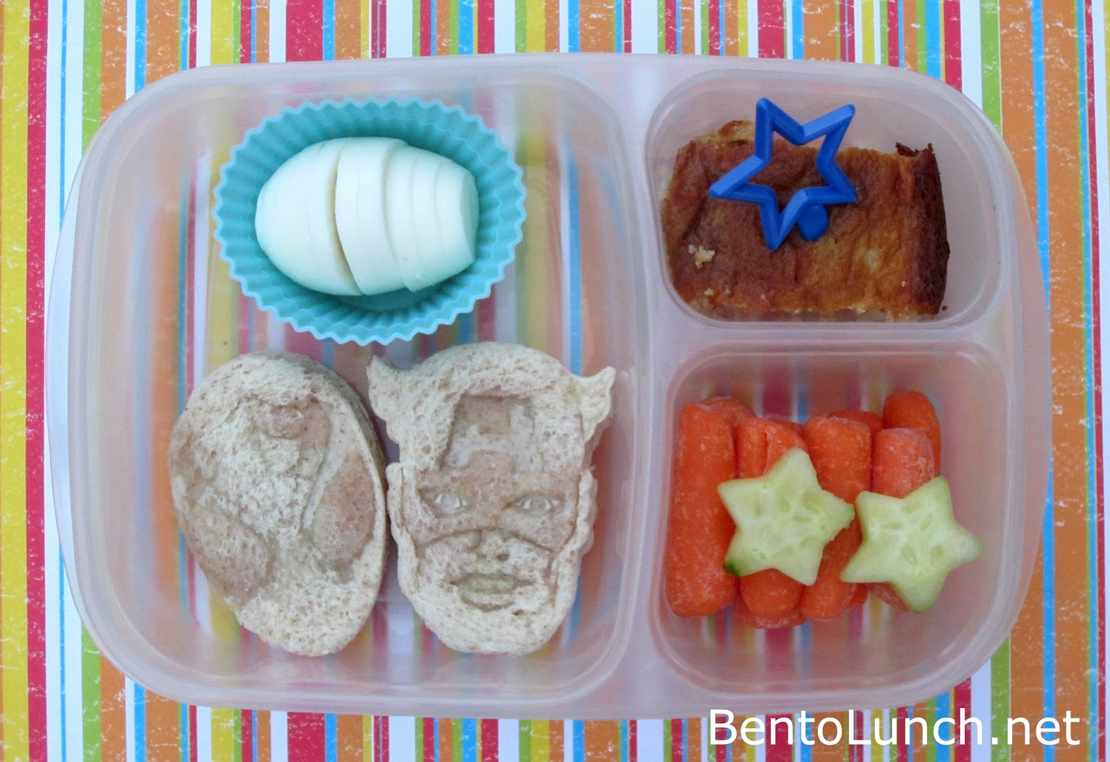 Ben has two cream cheese and raspberry jam sandwiches on honey wheat (works better than 12 grain for the cutters), one cut out as Spiderman, one as Captain America. To go with that, he has a boiled eggs, carrots and cucumber stars, and a piece of apple caramel cake I made the other night. We were out of lunch-sized fruits, so he had an apple in his bag instead.