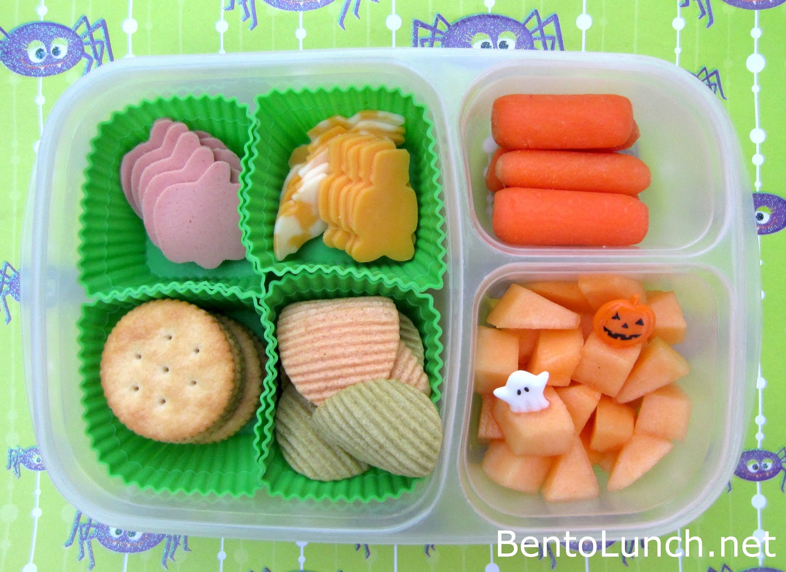 Ben has pumpkin shaped bologna pieces (nitrate-free), bat shaped marble cheese, Frankenstein shaped cheddar cheese, crackers, a few veggie chips, carrot sticks and cantaloupe (complete with Halloween picks). On the side, not pictured, was Chobani Champions Honey-Nana yogurt. Lunch is packed in our Easy Lunchboxes (also available on Amazon).
