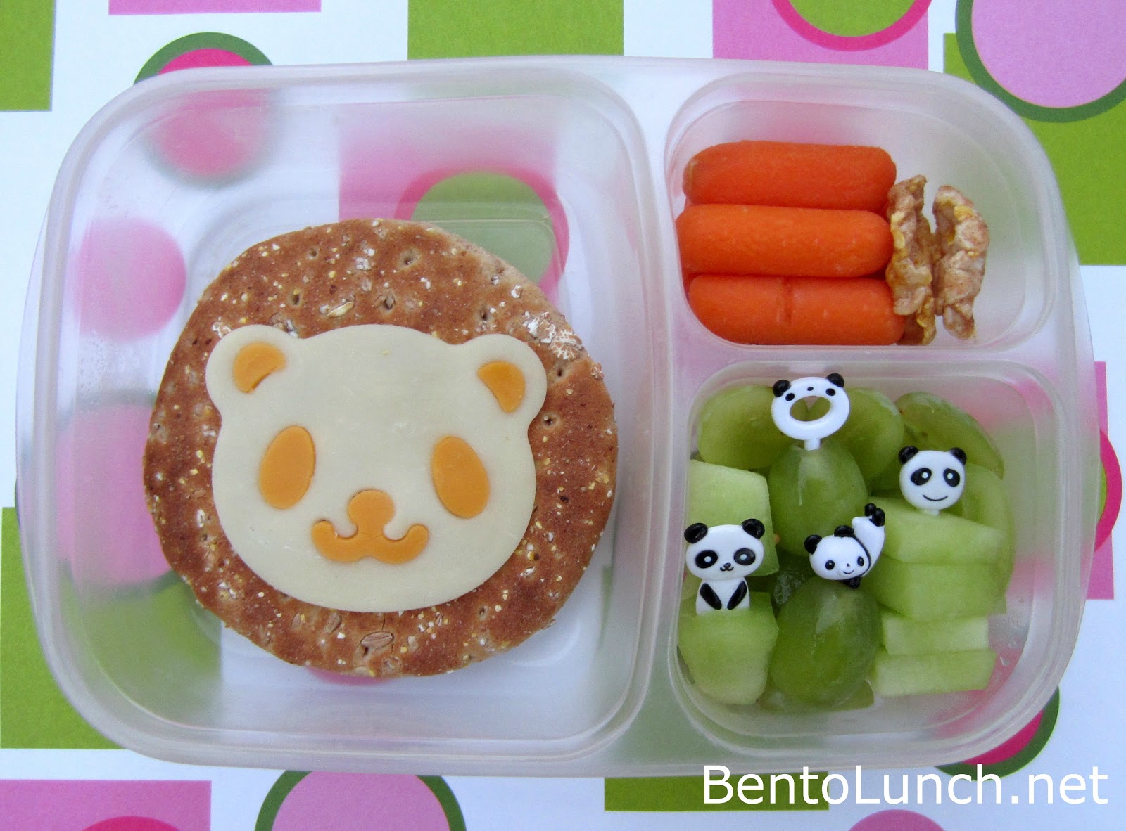 Faith has a turkey and cheese sandwich on multigrain rounds, topped with a white cheddar panda with orange cheddar accents, cut with the CuteZCute cutter. To the right, she has carrots, a couple of crisps and honeydew and green grapes, topped with a variety of panda picks. The lunches are packed in our Easy Lunchboxes (also available on Amazon).