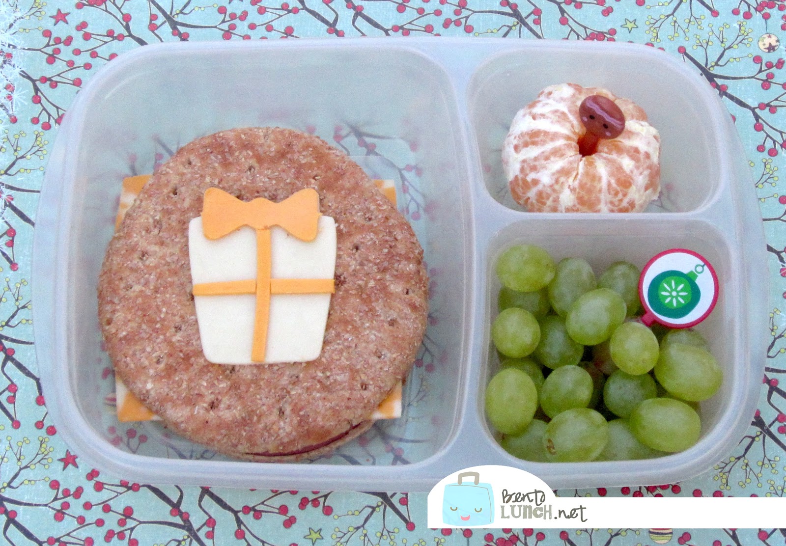 Friday, they had sub sandwiches on whole wheat rounds.  Why sub sandwiches?  Because I had a little bit of several kinds of meat left, so I did a bunch of one slice of each so there was enough on each sandwich.  It's topped with a cheese present from my new cookie cutters.  The bow is made by inverting the top bow and the stripes are just a couple of quick knife cuts.  To the right, the kids had cutie oranges with gingerbread picks and grapes with ornament picks. Lunch is packed in our Easy Lunchboxes.