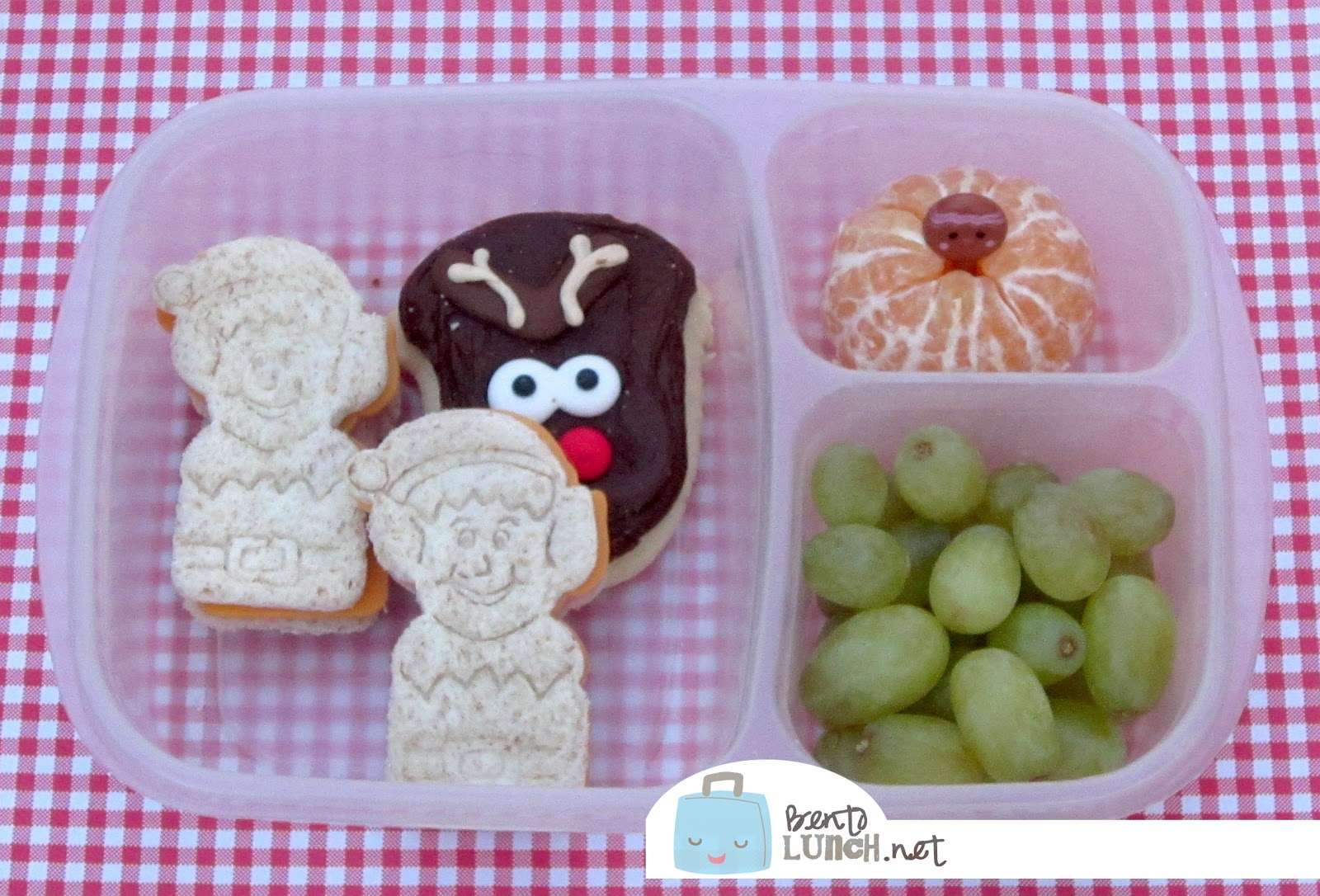 Ben had two Elf in the Shelf sandwiches, made from honey wheat bread (so the presses show better) and filled with turkey & cheese. He also had a Rudolph cookie that Nana sent him, a cutie orange and grapes. I'm a bit low on some lunch fixings, but with Christmas vacation coming up, I'd rather double the fruit to use it out than to buy more veggies. I like to leave an empty fridge when we are away. Lunch is packed in our Easy Lunchboxes.