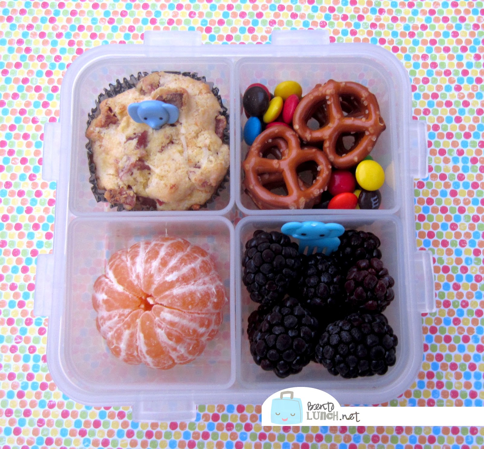 Ben has a corndog muffin, accented with an elephant pick for his entree, along with some pretzels and a few leftover M&Ms for a treat (the absence of red and green M&Ms are due to Christmas baking).  The bottom holds a cute orange and some frozen blackberries, along with a small elephant fork-pick.  Since the blackberries will thaw by lunch, I thought the boy might appreciate a way of eating them without getting juice on his hands.  It's packed in a 4-square Lock&Lock container, which is still a favorite of mine after all these years.