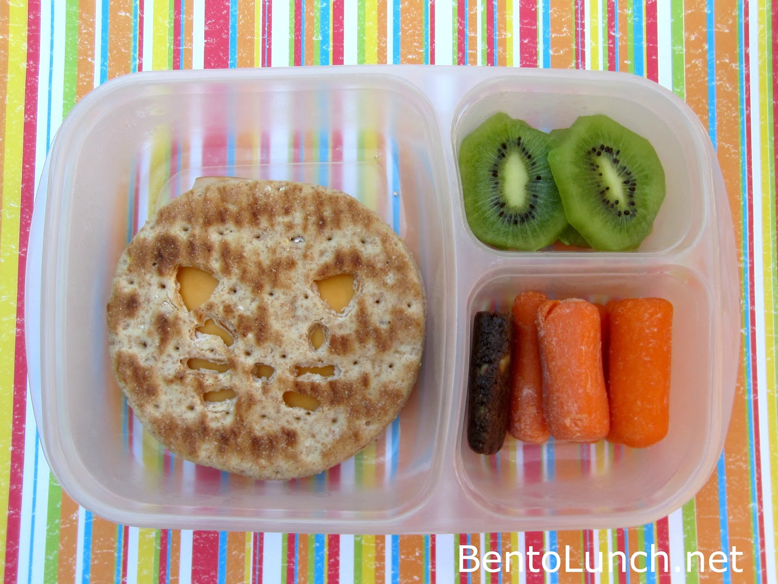 In this lunch, Ben has a turkey and cheese sandwich on whole wheat rounds. Instead of a top decoration, I used my CutezCute kitty face to cut a bit out of the bread. You may need to zoom in for the details. To the right, he has kiwi, carrots, and a mini fig bar. Lunch is packed in our Easy Lunchboxes (also available on Amazon)