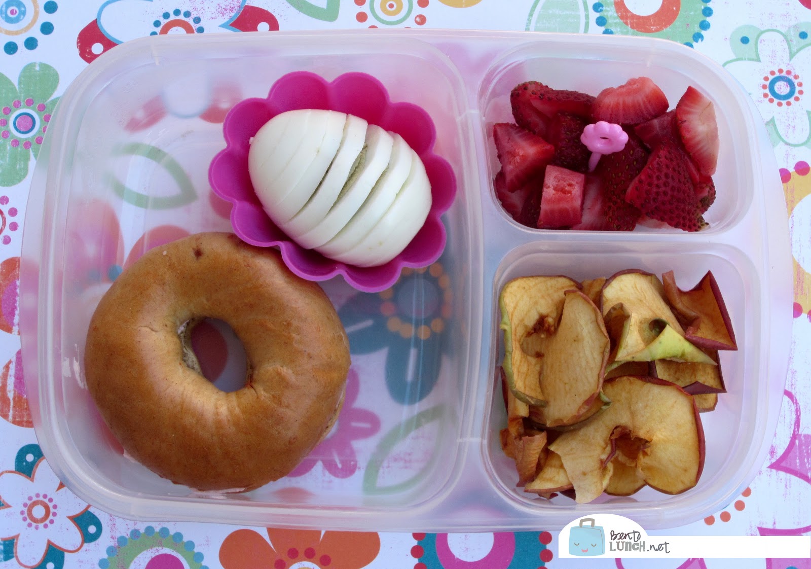 Both kids had the same lunch again--a cinnamon bagel with strawberry cream cheese, a boiled egg already peeled and sliced, strawberry chunks, and dried apple pieces. I also sent some cheese and crackers for a snack for some extra protein. Once again, we're packed in our Easy Lunchboxes. since I prepacked these lunches on the weekend.