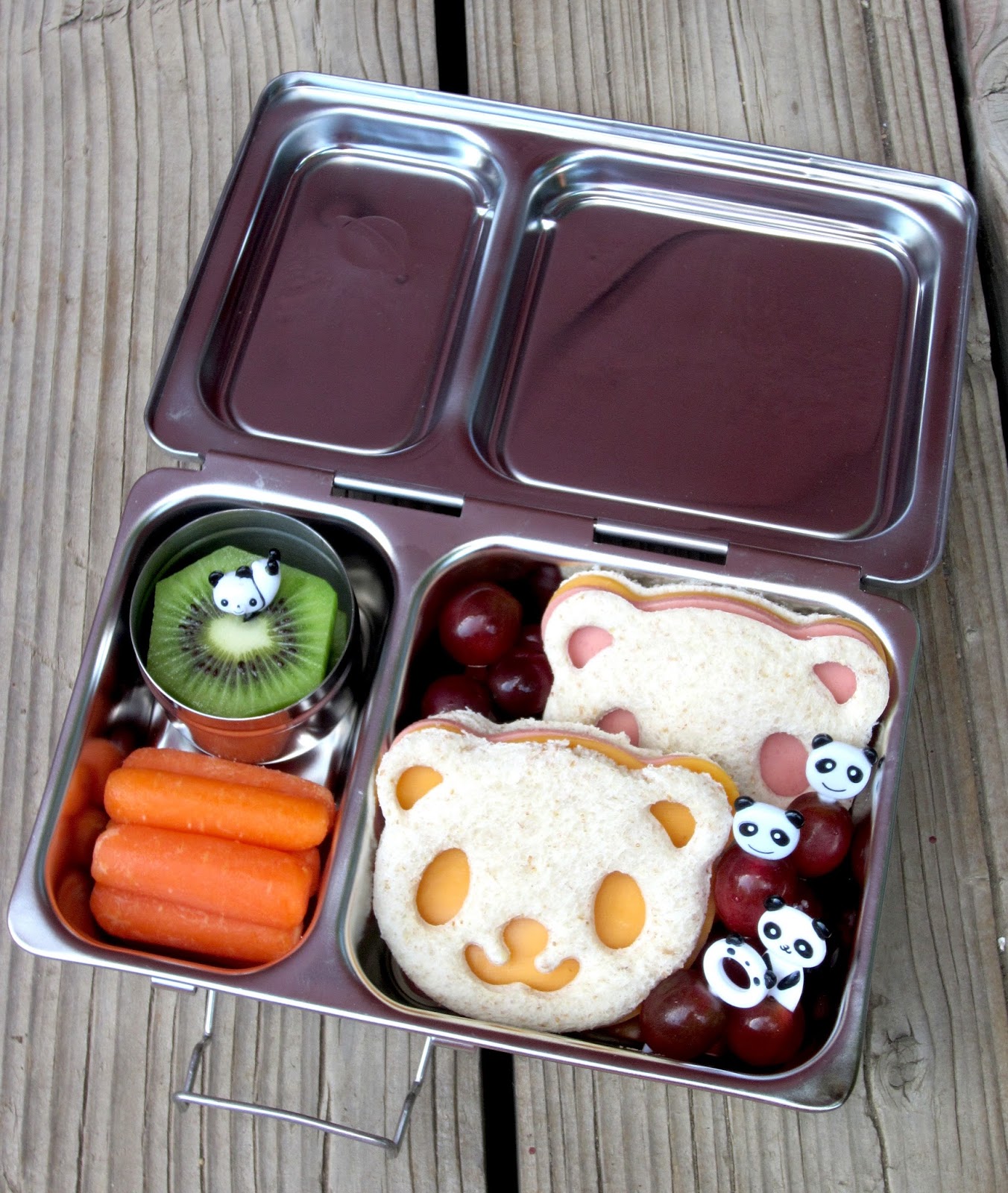As shown, we managed two panda sandwiches, cut with our CutezCute cutter, which filled most of the main compartment. The smaller side holds carrot sticks and a kiwi in the tall Dipper to prevent leaks, then the empty spaces have grapes. This one ended up being Faith's lunch and was plenty of food for her.