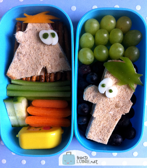 We have two Phineas and Ferb sandwiches, cut from multigrain bread, although I have no recollection what they are made of.  They aren't as hard to cut out as you'd think, just cut one slice of bread first, then use that piece as a template for the second.  I recommend not filling the sandwiches until after you make finish the cutouts.