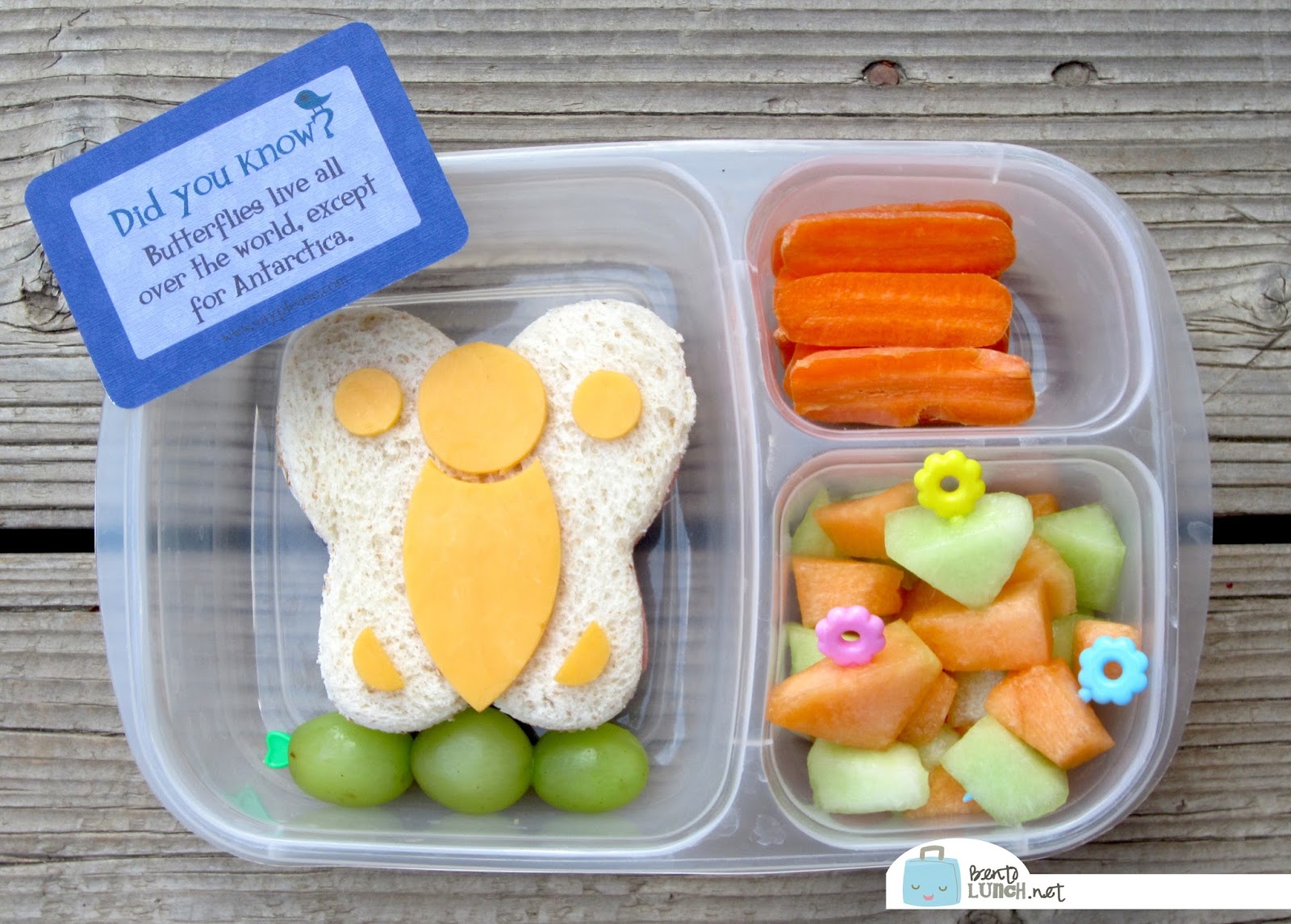 Last night, Faith took a turkey and cheese sandwich on honey wheat, cut with our butterfly LunchPunch and accented with some cheddar cheese designs, some carrots, some melon with flower picks for the butterflies, and a few grapes. It's packed in one of our EasyLunchboxes and our Lunchbox Love note is butterfly themed too!