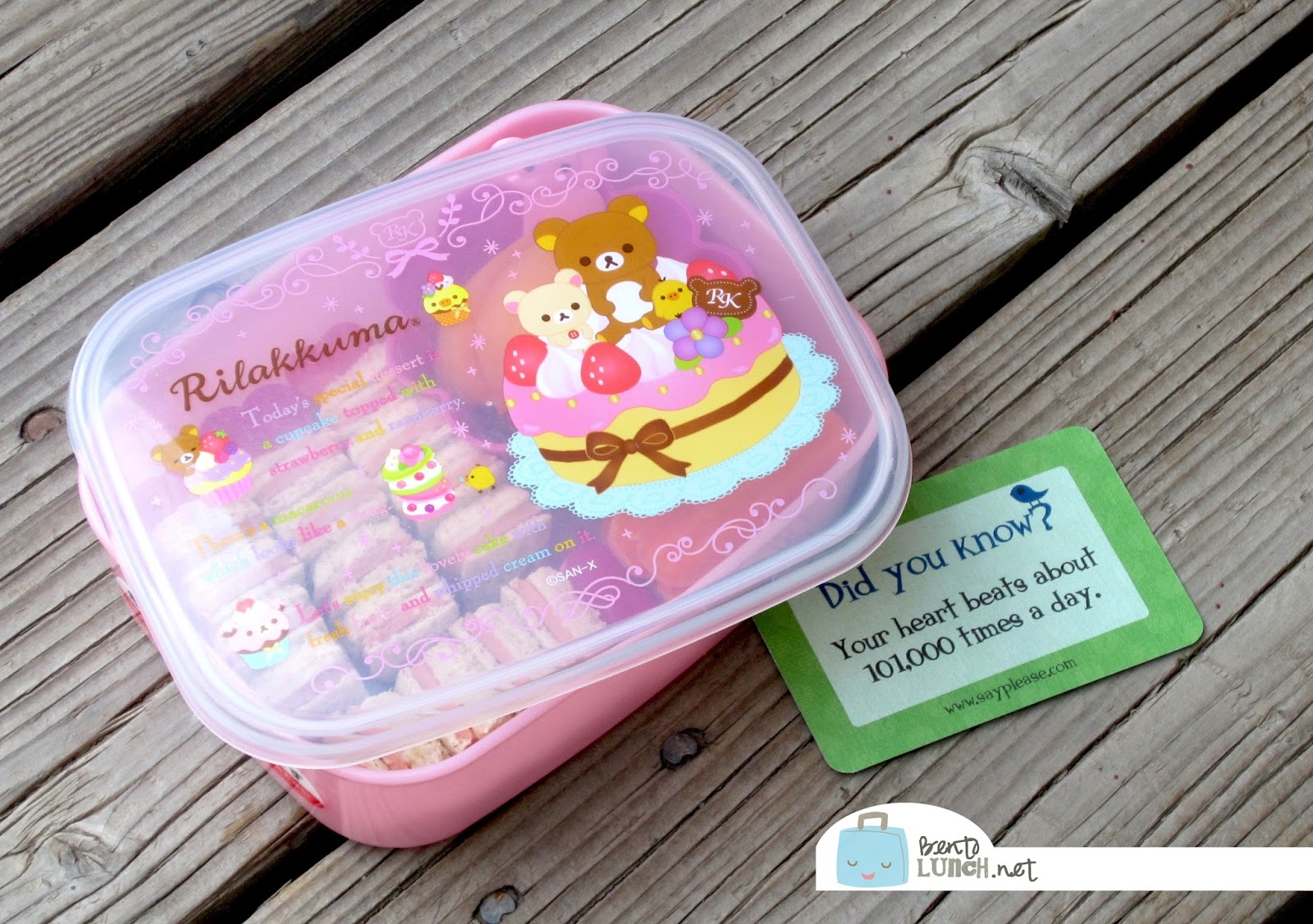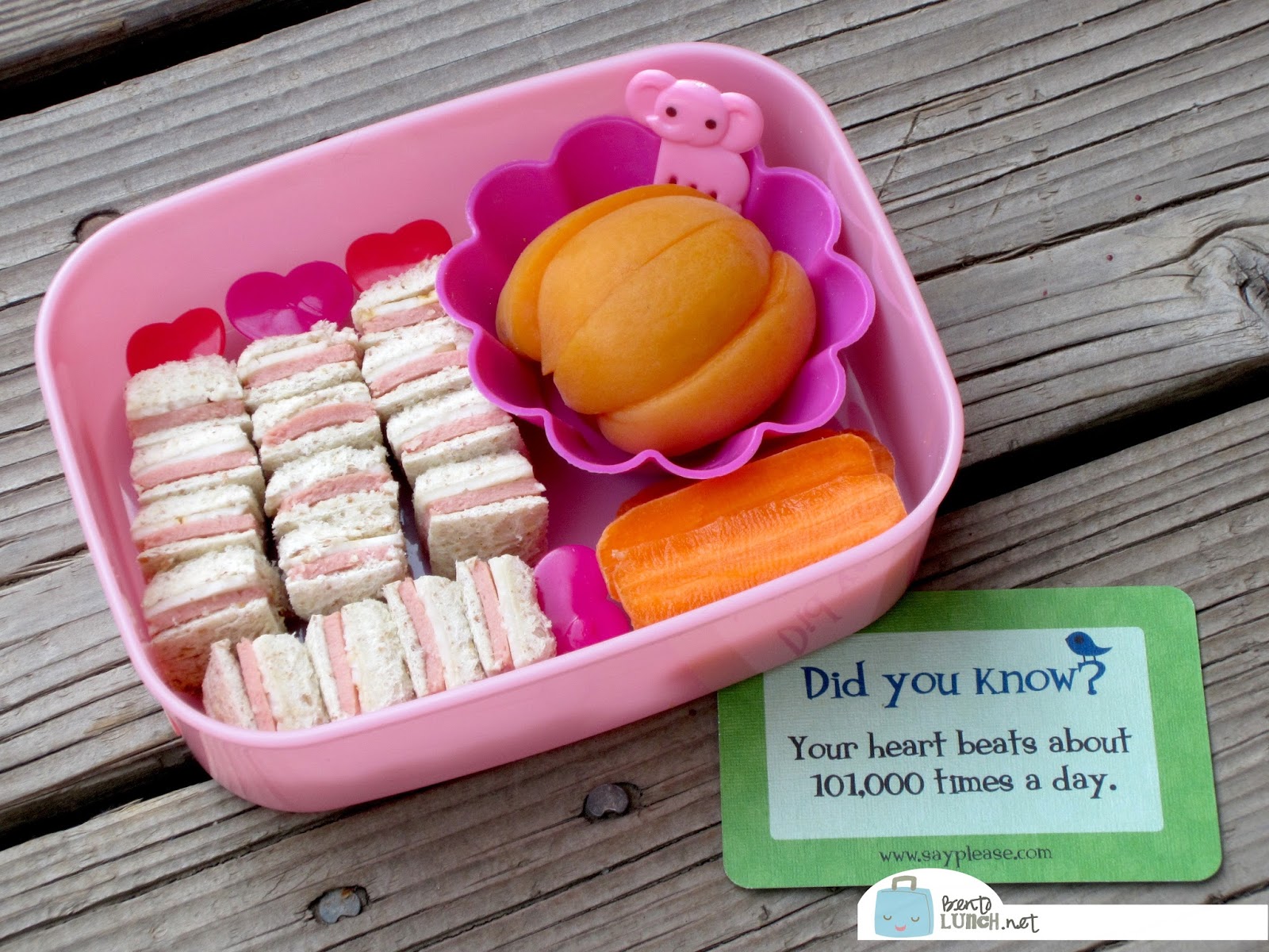 Since she thinks snack = small meal, I opted to pack her a ham and muenster cheese sandwich on honey wheat, cut into teeny squares and skewered on heart picks, an apricot, sliced/pitted in a silicone flower cup, and some carrots. The heart picks were to match our Lunchbox Love note about how often the human heart beats. Snack is packed in one of our Rilakkuma boxes, which is from a set of three stacking ones.