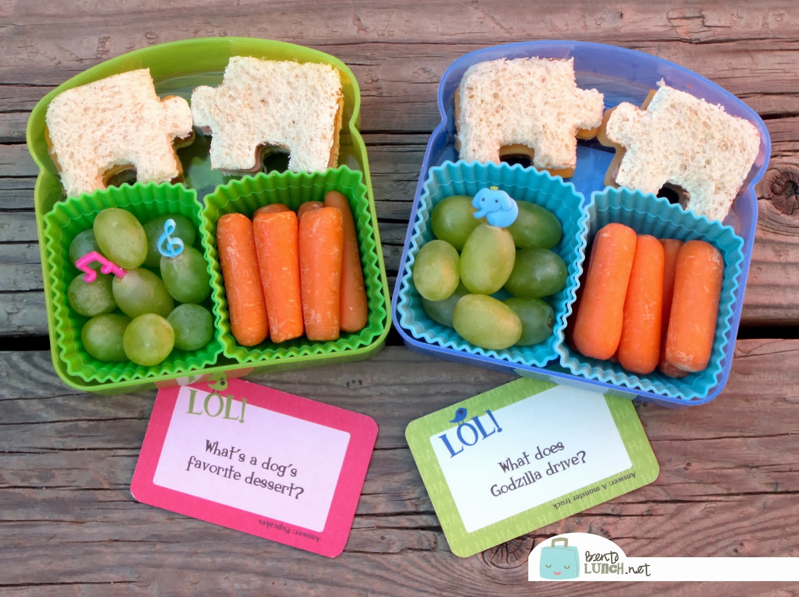 The kiddos needed a quick mini-lunch, so they took puzzle piece sandwiches (ham and cheese on honey wheat), cut with our Lunch Punch puzzle cutter. The boxes are old sandwich containers that work well for mini punches, if you cut up the sandwiches. They also had grapes and carrots, along with (not pictured) applesauce in our Squeez'ems containers and yogurt in a reusable cup. And this week, we're using our new Lunchbox Love notes--these ones have jokes!