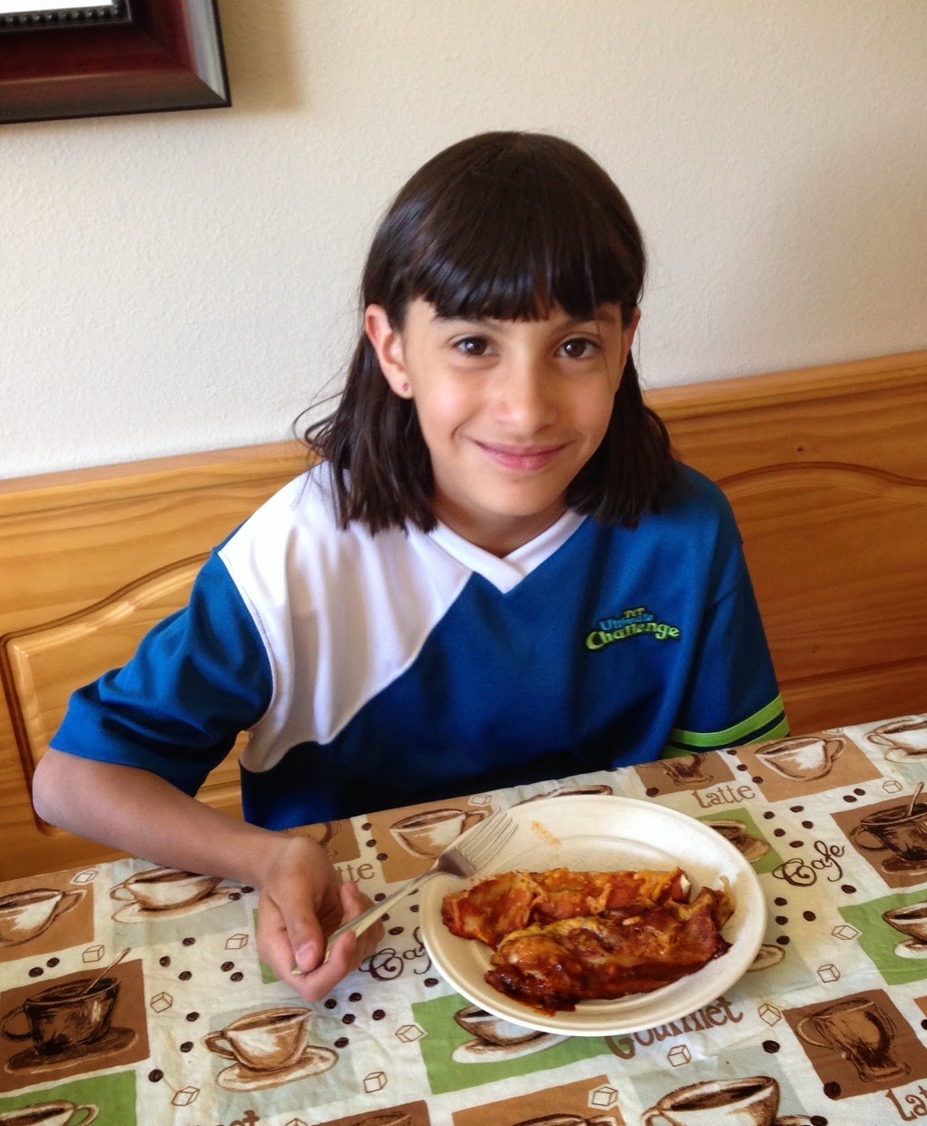 This week, I heated up a pan of Old El Paso Beef Enchiladas and a pan of Old El Paso Chicken Enchiladas. Each meal serves two and I needed food for F&B and me, so I opted for leftovers instead of not enough. And since the kids really like the food, it's not like there are many leftovers. To cook them, it was just 45 minutes in the regular oven, so I got them ready, put them in, then picked up the kids. Dinner was ready about 10 minutes after we came home!