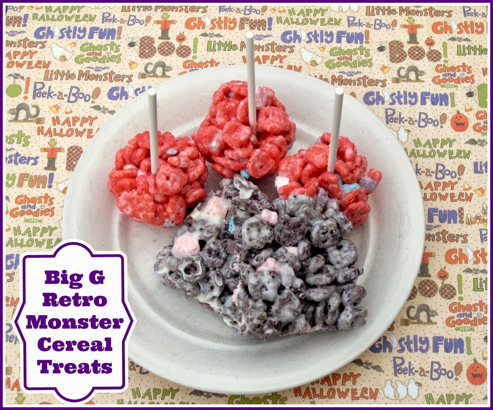 F&B and I decided we needed to make our own Retro Monster Cereal Treats, so we opted for two choices--Monster Cereal Pops and Monster Cereal Squares. The actual recipe is the same, I just pressed one set into a pan and rolled the other set into balls by hand.