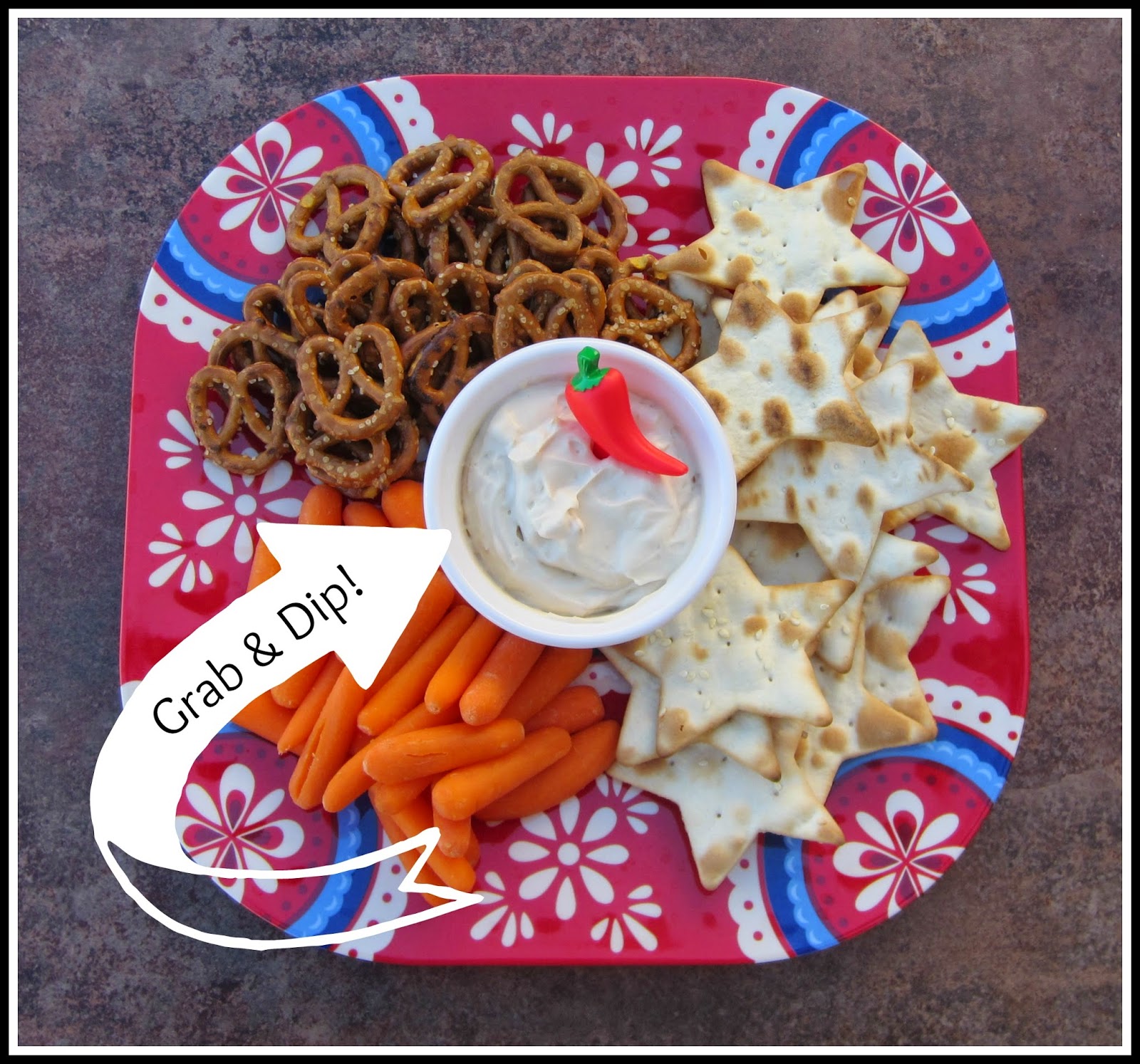 What are your favorite things to dip? I'm thinking a platter of veggies, plus some chips, crackers and pretzels would be perfect! We tried pretzels, flatbread and carrots on our taste-test round, but we also think cucumber or broccoli would be awesome.
