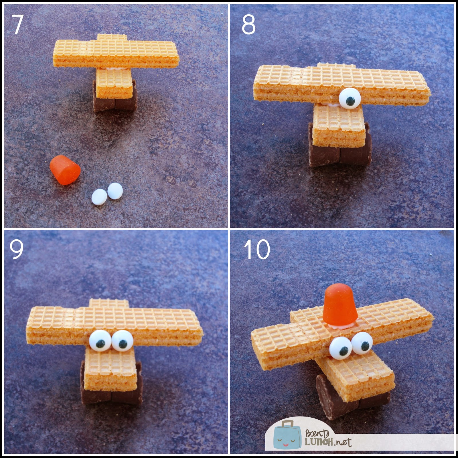 - With more icing, glue candy two eyes on the front of the wings above the nose of the plane.