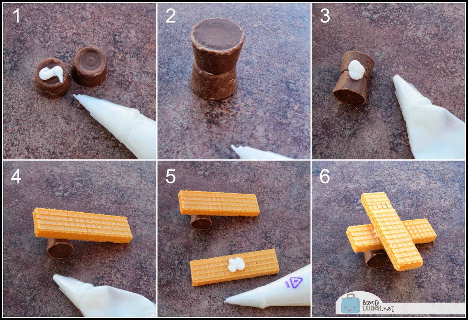 - Using icing to "glue" them, push two Rolos together at the narrow ends to make a wheel base.