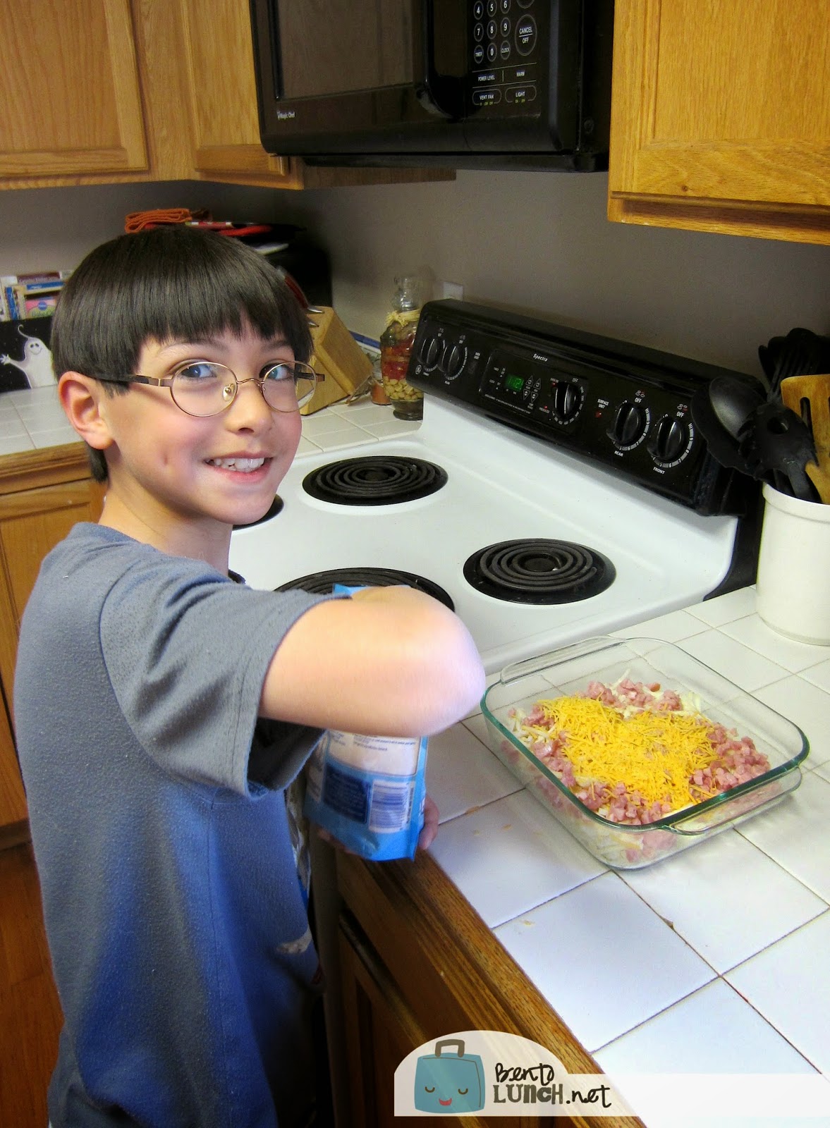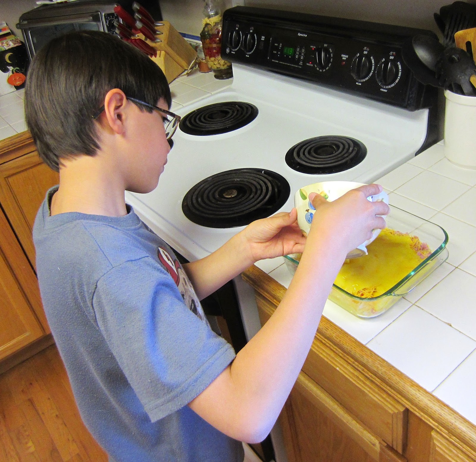 Ben and I had to make a recipe too, so he helped me make an easy breakfast casserole! It's a great way to help your kids get started in the kitchen and it's rather tasty too. I've made it for years, but I actually measured today since it's kind of a dump & cook style recipe. You can add other meats, different cheese, veggies, pretty much whatever you'd like to it!