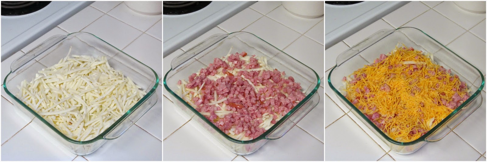 Add a layer of diced ham on top of the hash browns and sprinkle with the cheese.