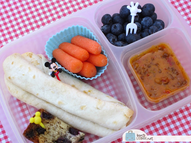 Lunch includes the three rolled chicken tacos, along with an Easy Lunchboxes Mini Dipper full of queso. This way, they could pull out the queso, warm it up and not worry about the rest of the food.