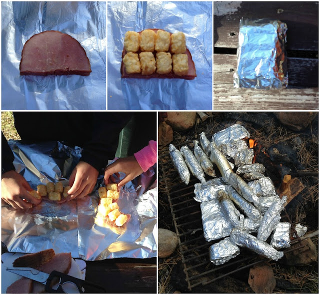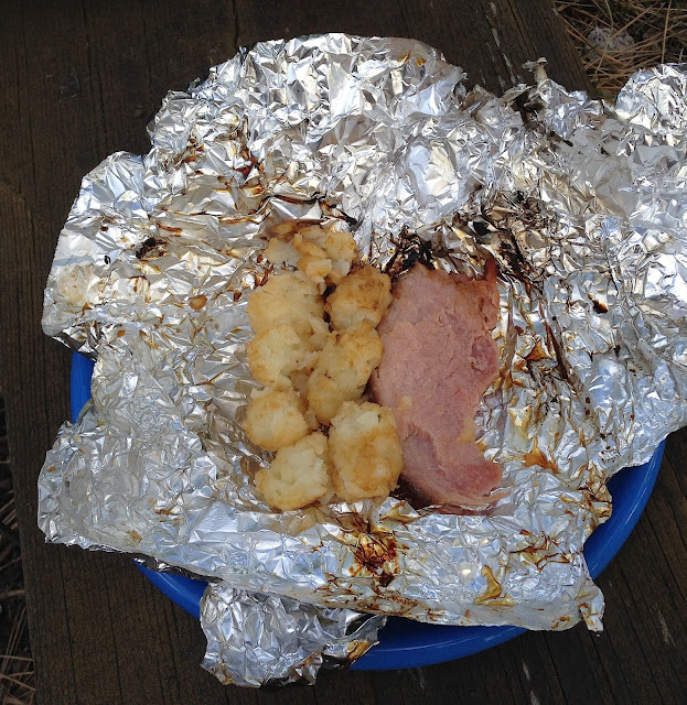 - Toss on the campfire rack, turning about halfway through cooking, about 10-15 minutes to warm the ham and cook the tots.