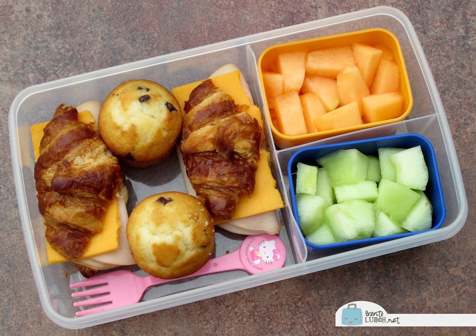 In this lunch, Faith took turkey and cheese on pretzel croissants because she was "not in the mood for chicken salad". Since I have both, it wasn't a big deal either way, and I think she prefers chicken salad scooped onto crackers. To the right, she took larger containers of cantaloupe and honeydew, since she didn't feel like berries, and in between her sandwiches, we tucked two mini blueberry muffins. Not pictured, she also took yogurt and a granola bar for snacks.
