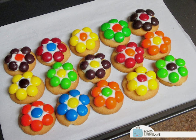 Remove from oven and press one round candy into the center of the candy melt, then press six more circle candies around to form a flower.