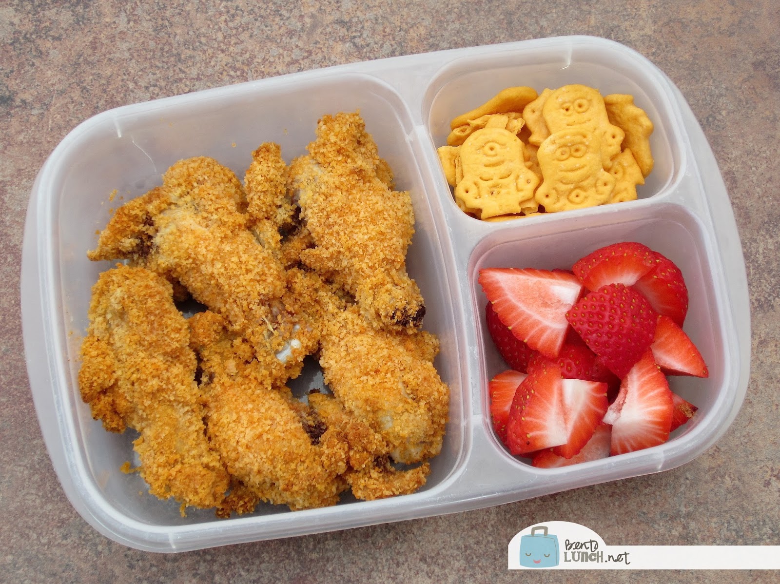 This lunch was also made from the leftovers in the freezer. I had one pack of chicken drummettes left, so I baked them in a crunchy Buffalo coating. Not pictured, I send along a mini dipper full of ranch to dip them in. To the right, the kids picked the last of the strawberries and some Minion crackers that we still had opened. I had made sure to save a yogurt per day per kid, so they took those as snacks along with one last squeezy applesauce and some Pirate Booty.