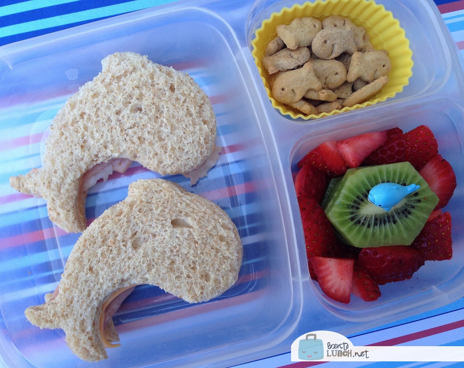 To the left, we have ham and cheese sandwiches on whole wheat bread, cut with a Lunch Punch cutter to make fish shapes. To the right, we have cinnamon and honey Goldfish Grahams (I received samples of both these products to test out) tucked into a silicone cup, some cut up strawberries, and a sliced kiwi with a fish/dolphin pick for cuteness. Lunch is packed in our Easy Lunchboxes.