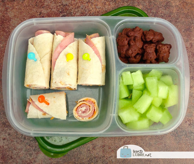 We haven't made wrap sandwiches in awhile and I had some fresh tortillas, so I made Ben homemade wrap sandwiches. Wraps keep well in the fridge if you don't add lettuce, and Ben isn't much of a lettuce fan on his sandwiches. I warmed the tortillas in the microwave for about 8 seconds, spread garden herb cream cheese on them, sprinkled shredded cheese, then layer on deli ham and rolled them up. As you can see, I was going to slice them into rounds because they look prettier, but decided after cutting the first one that it was much easier to add a pick and just leave them as is. The 5-day camp idea was to make lunch easier, not more complicated. On Thursday morning, Ben wanted chocolate Teddy Grahams for his sweet, then he took his usual round of snacks (yogurt, applesauce, and protein bar).