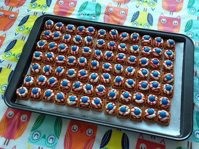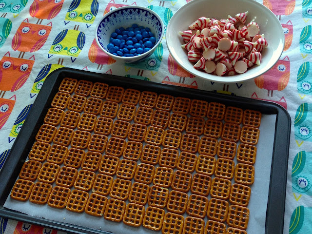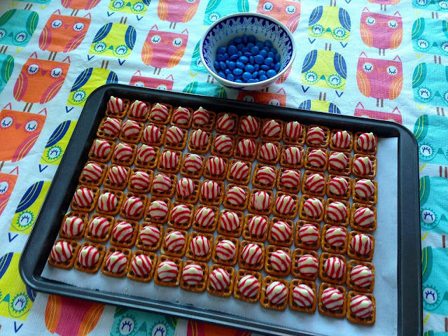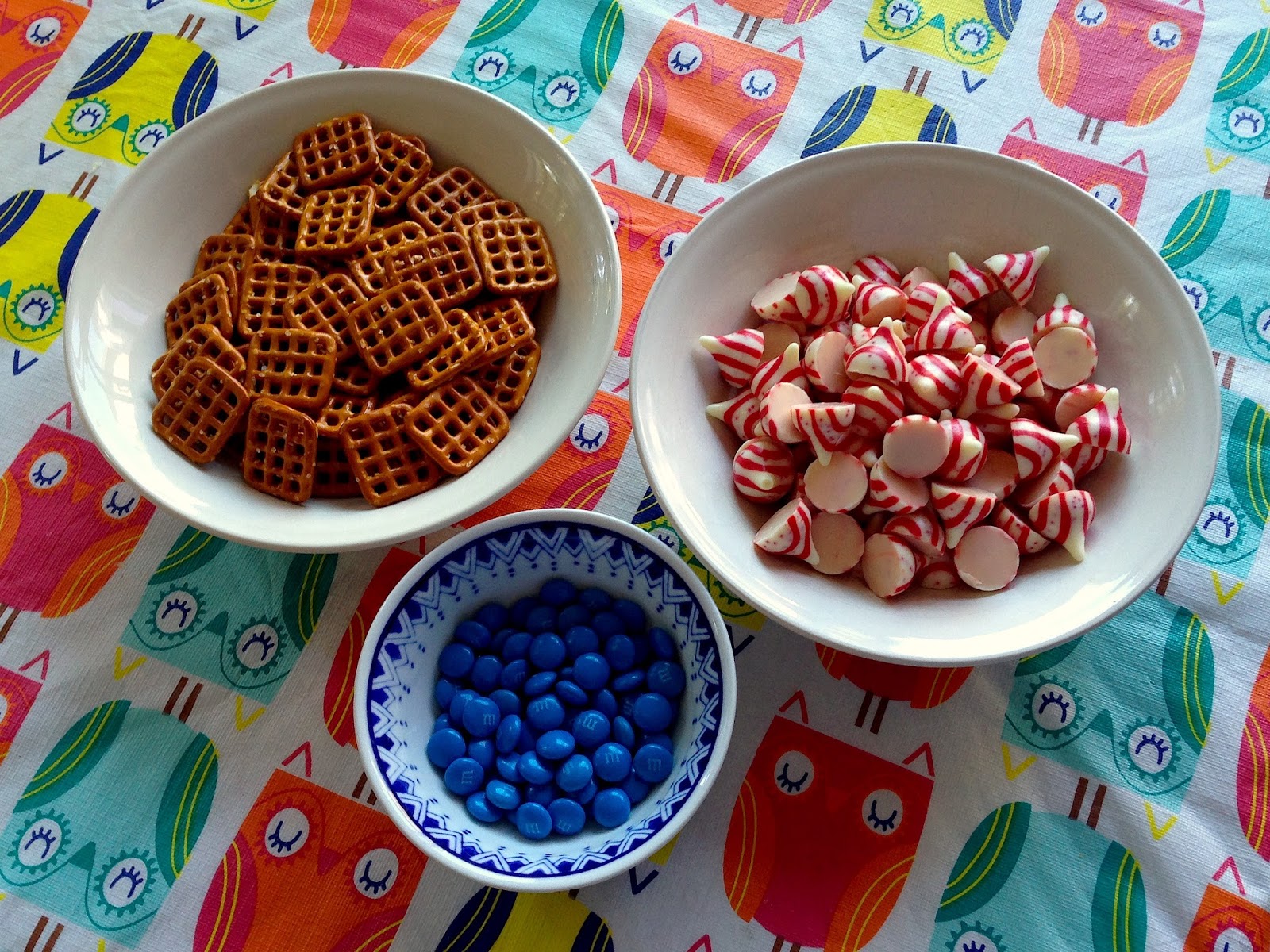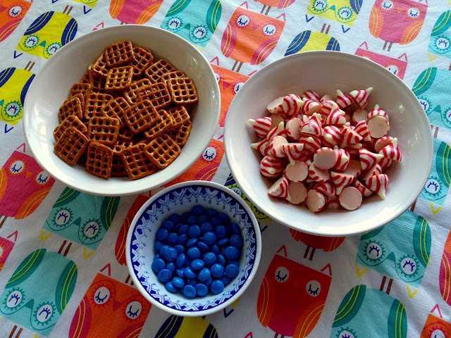 What You Need: Butter pretzel squares/grids, Hershey's Peppermint Kisses, blue M&Ms.