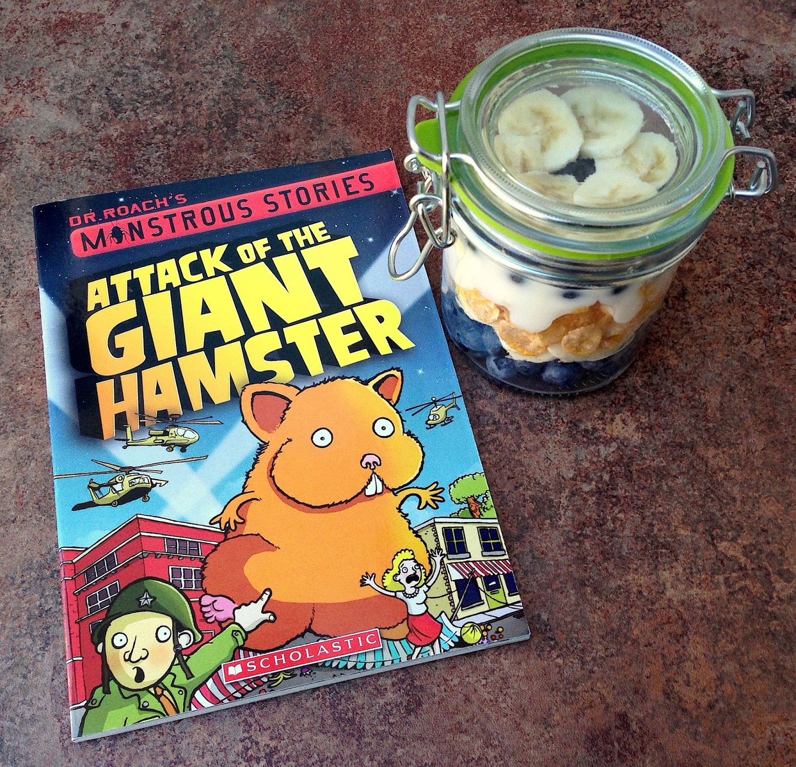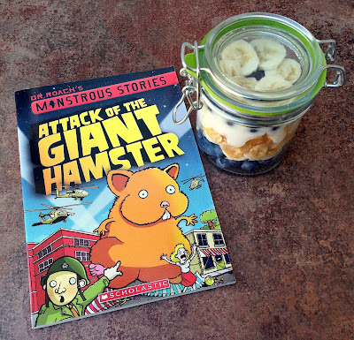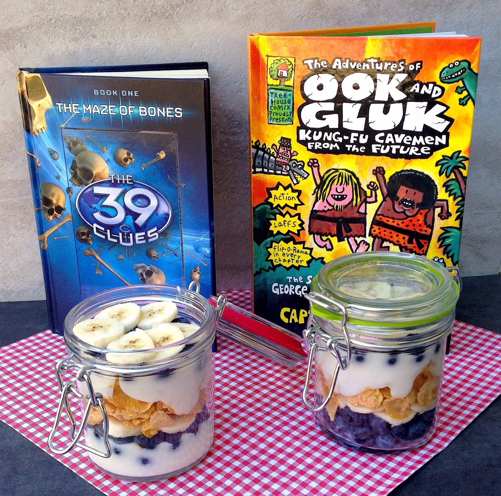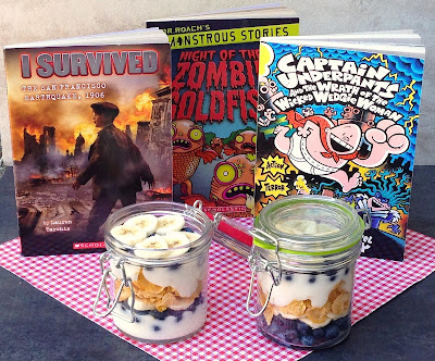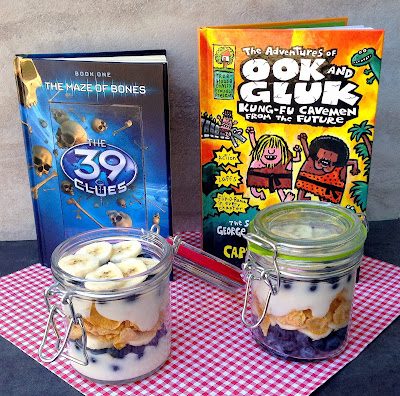 And what goes best with a book? A yummy snack. We made banana-bluberry parfaits to enjoy while we were reading this week, but they'd be an awesome dessert or breakfast too. Or how about for na after school snack to get you through to dinner with fruit, yogurt, and a yummy treat? The possibilities are endless, just switch up the fruits or cereal. Here's how to make our version: