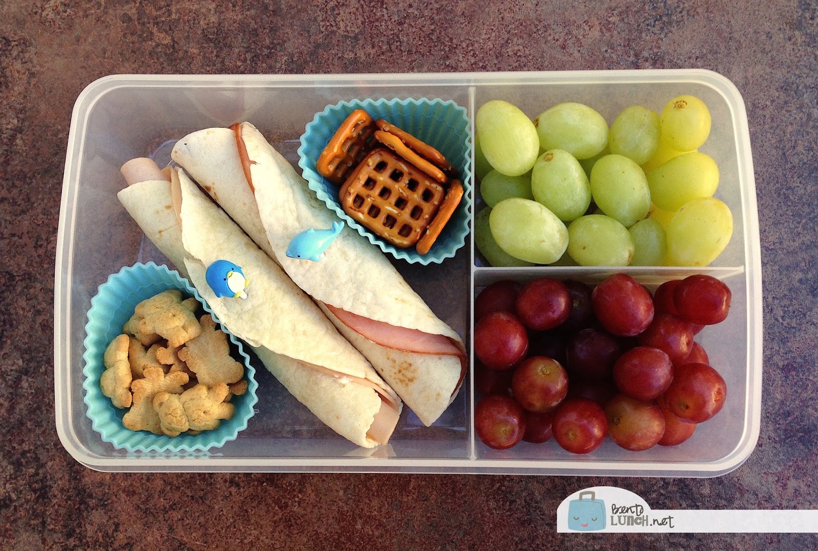 Ben has two wraps--tortillas with veggie cream cheese, shredded cheese, then either turkey or ham (one of each) for his main course. I added purple and green grapes in the side boxes, without the smaller boxes since grapes aren't messy, then a few honey bear grahams and pretzels to add a treat. I've been freezing yogurt tubes and applesauce pouches to act as extra icepacks and Ben reports they are still cold and "slushie-like" by the time he eats them.