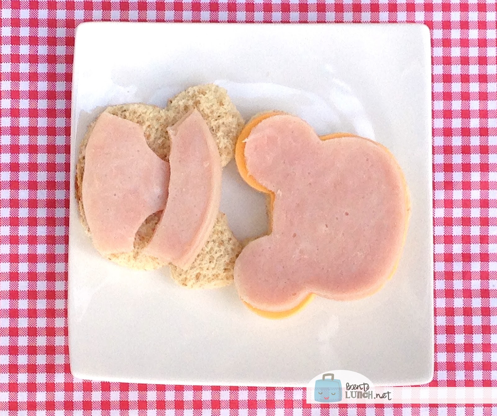 Would you like a trick to making these sandwiches? Cut each ingredient separately. If you make the sandwich, then cut it out, the bread often tears from the thickness. But cut the bread, the meat, and the cheese separately, and assemble it for a perfect fit. And since one of the concerns about sandwich cutters is the waste, just cut the extra meat or cheese and tuck it inside the sandwich like we do.
