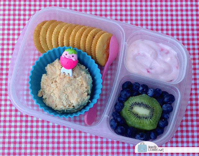 Our second lunch is a favorite style with a new recipe. While we were out and about the other week, they were giving out samples of a chicken salad, mixed with hummus instead of mayo. Faith and I feel in love with it and immediately, it was an "I can make that" moment. So in honor of our new discovery, this lunch has chicken salad and crackers mix. The chicken salad is tucked into one of our jumbo silicone cups, since those touch the lid of the box and don't move or spill. I added crackers to go with it, but it could make a great sandwich too. Sliced kiwi and blueberries filled our fruit compartment and strawberry yogurt rounds out the meal.
