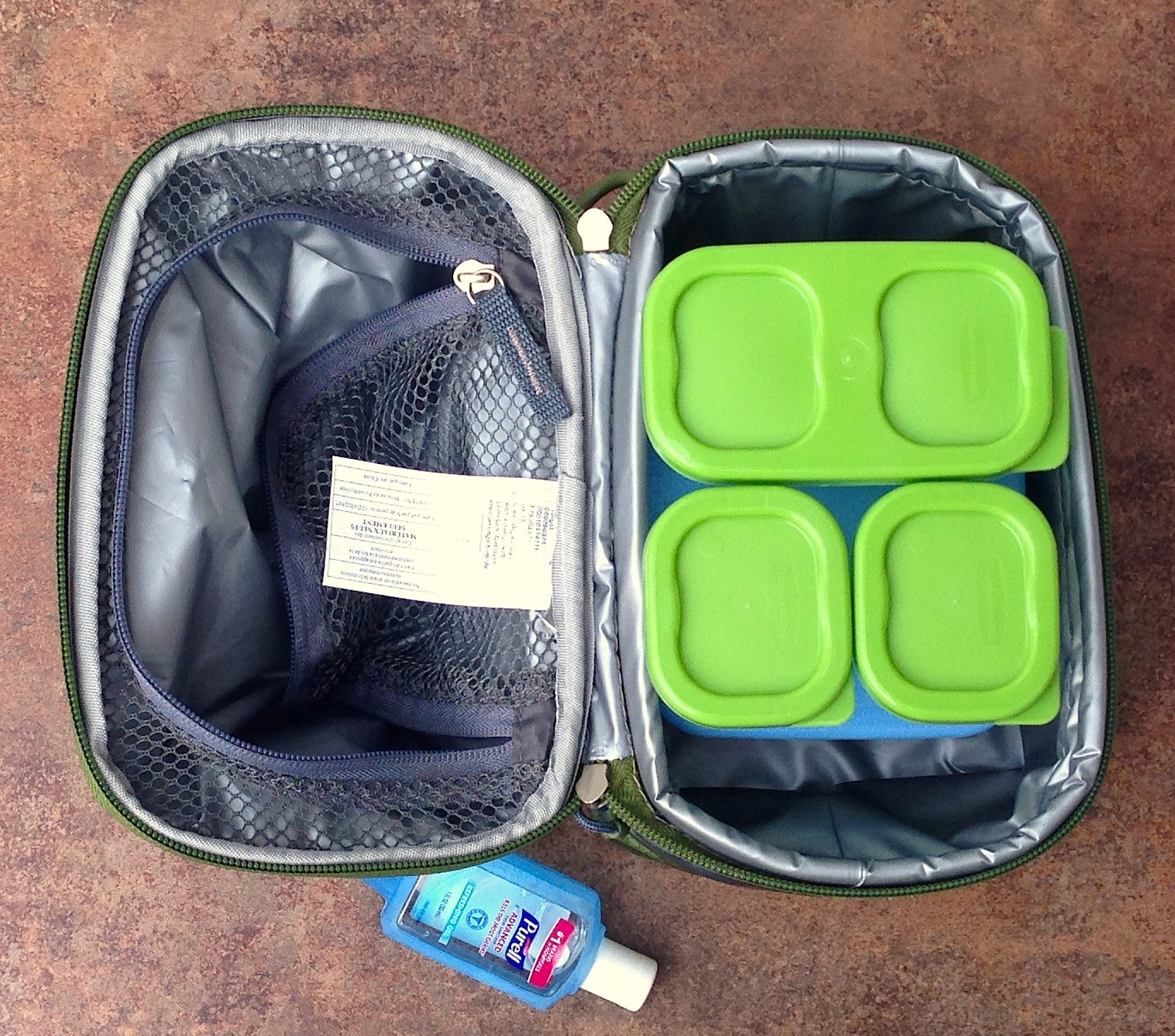 Lunch bag, containers, and PURELL®, all configured!