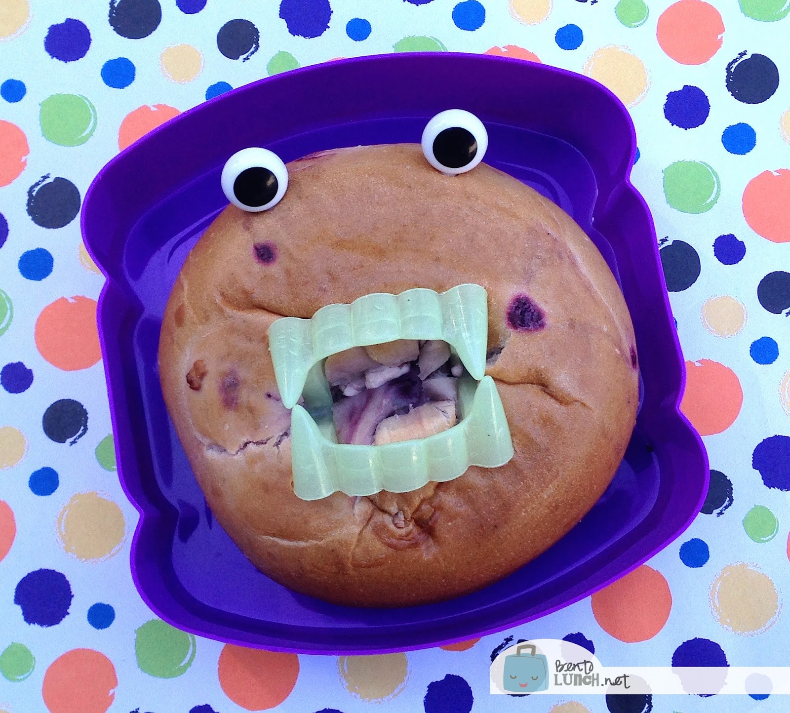 First up, we made a Count Dracula, or Vlad, bagel-wich! The kids love toasted bagels with cream cheese for lunch. Dracula is a blueberry bagel with mixed berry cream cheese. To turn our bagel into a vampire, we added a set of vampire teeth into the hole part of the bagel and a couple of eye picks to make the face. If you don't have eye picks, candy eyes or even M&Ms will do in a pinch. Our vampire teeth came in a 20-pack, so we'll be playing with those all month long.