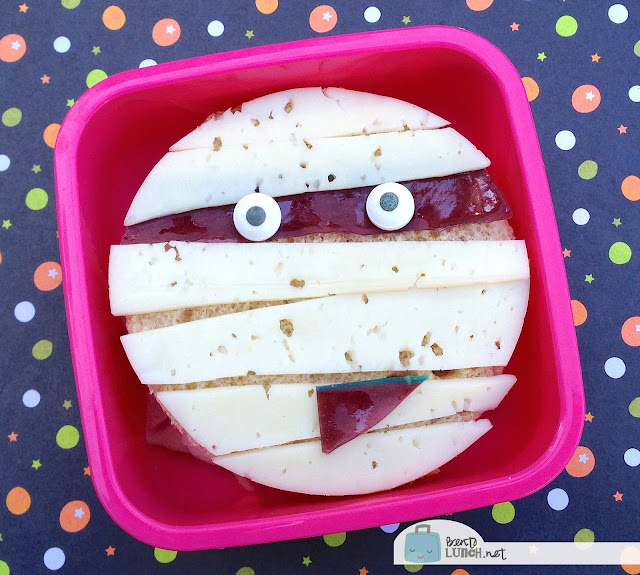 Our second easy idea is for a Murray the Mummy sandwich. Once again, we didn't use fancy tools. We made our ham sandwich on honey wheat and used a large circle cutter to make it round. I cut a piece of havarti with the same cutter, then used a knife to make strips for the bandages. They don't have to be straight cuts, I actually think they look better a bit uneven. I removed one strip near where I wanted the eyes, then cut a strip of purple Fruit by the Foot to replace it. I added candy eyes on the purple part and cut one more small bit for a mouth.