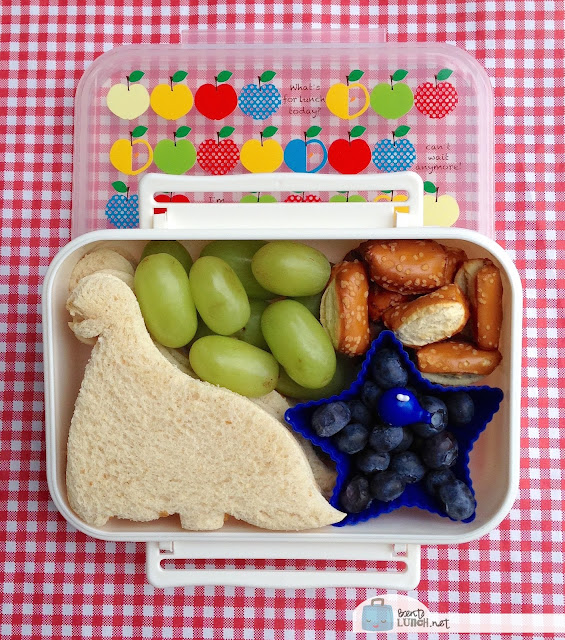 Since the sandwich and blueberries are separate, I stabilized the rest of the box with grapes and pretzel nuggets.  Grapes are my current favorite lunch add-in since they aren't messy, they don't leave juice or affect the food next to them, and they are sturdy enough to actually stop other foods from moving.  What more could you ask for?