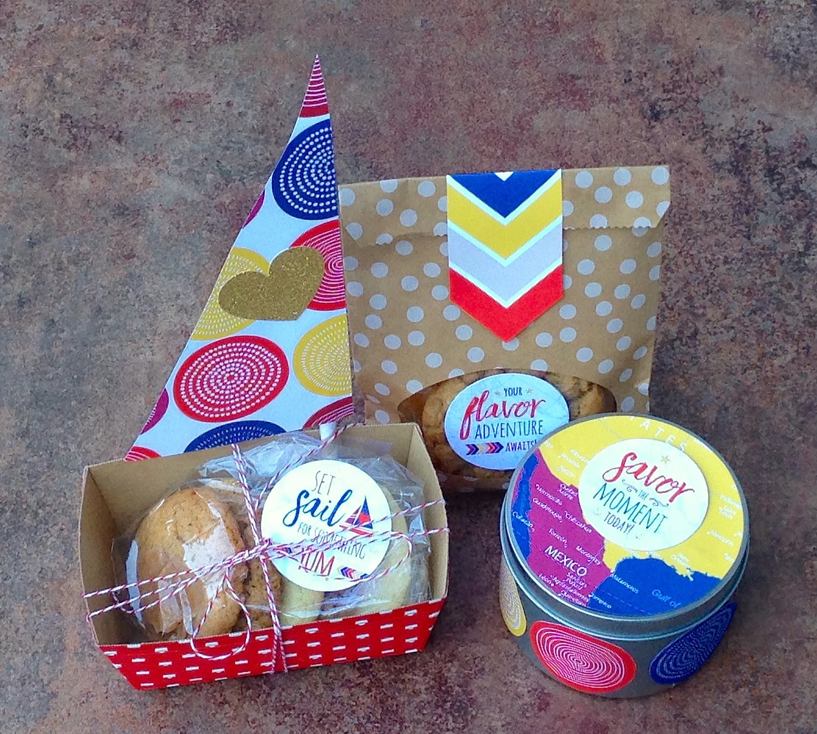 The bag idea is another cute option. The peek-a-boo window shows the cookies, then the chevron print scrapbook paper adds a pop of color, along with a faux seal (the bag itself is sealed below the printed paper). Once again, the tag makes the package.